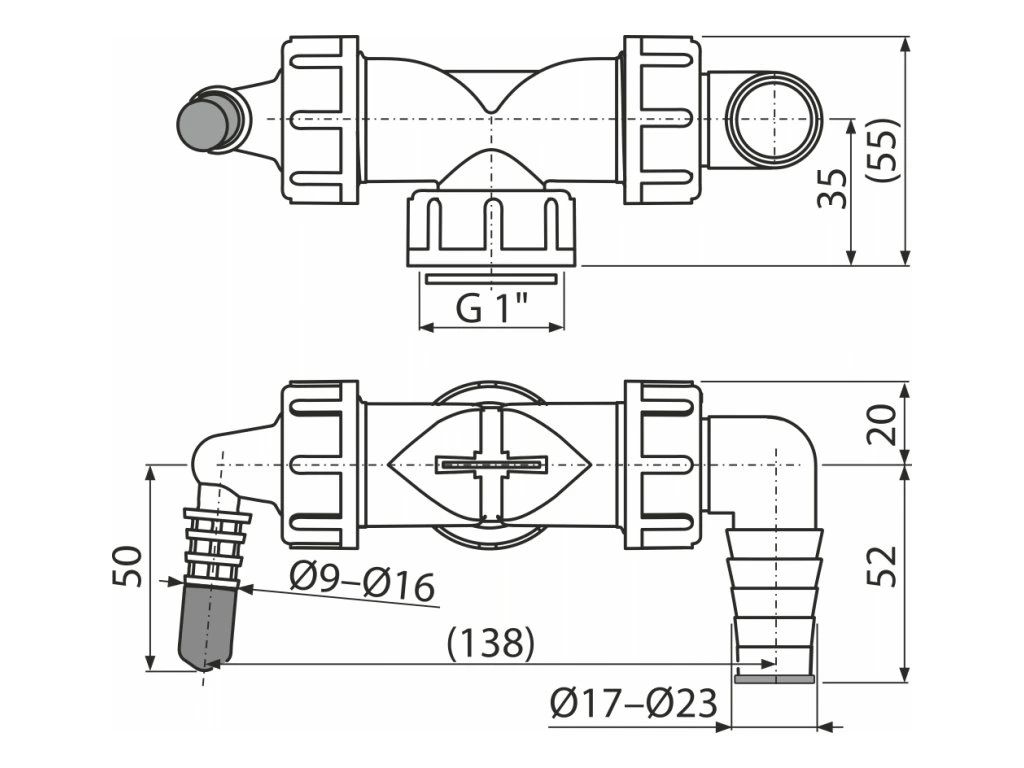 ALCA Dvojité kolínko G 1" × Ø 8–23 mm pro napojení pračky a sušičky na sifon, se zpětnými klapkami P156Z-G1