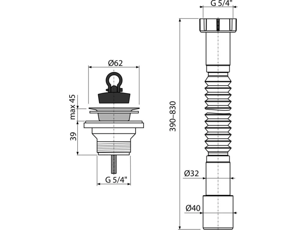 ALCA Flexi připojení G 5/4" × DN 32/40, plast + Výpust umyvadlová G 5/4" s nerezovou mřížkou Ø 62 mm, pryžová zátka A750+A31