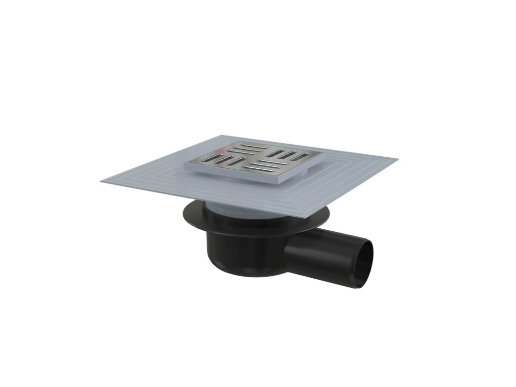 ALCA Podlahová vpust 105×105/50 mm boční, mřížka nerez, límec 2. úrovně izolace, suchá zápachová uzávěra APV26C