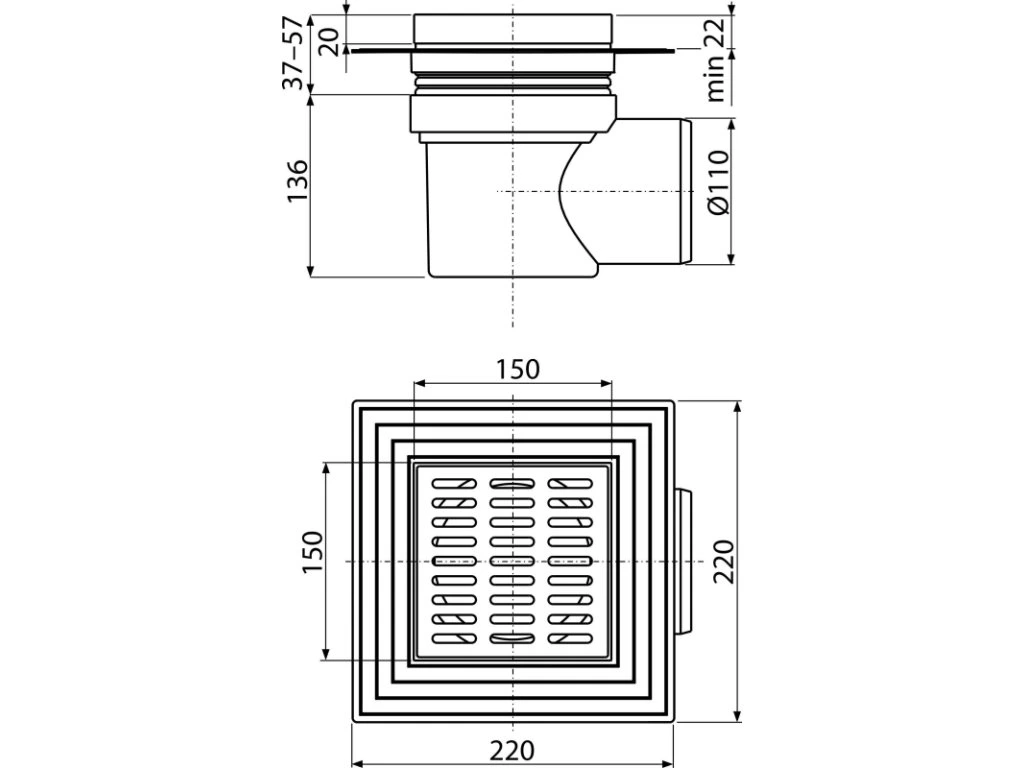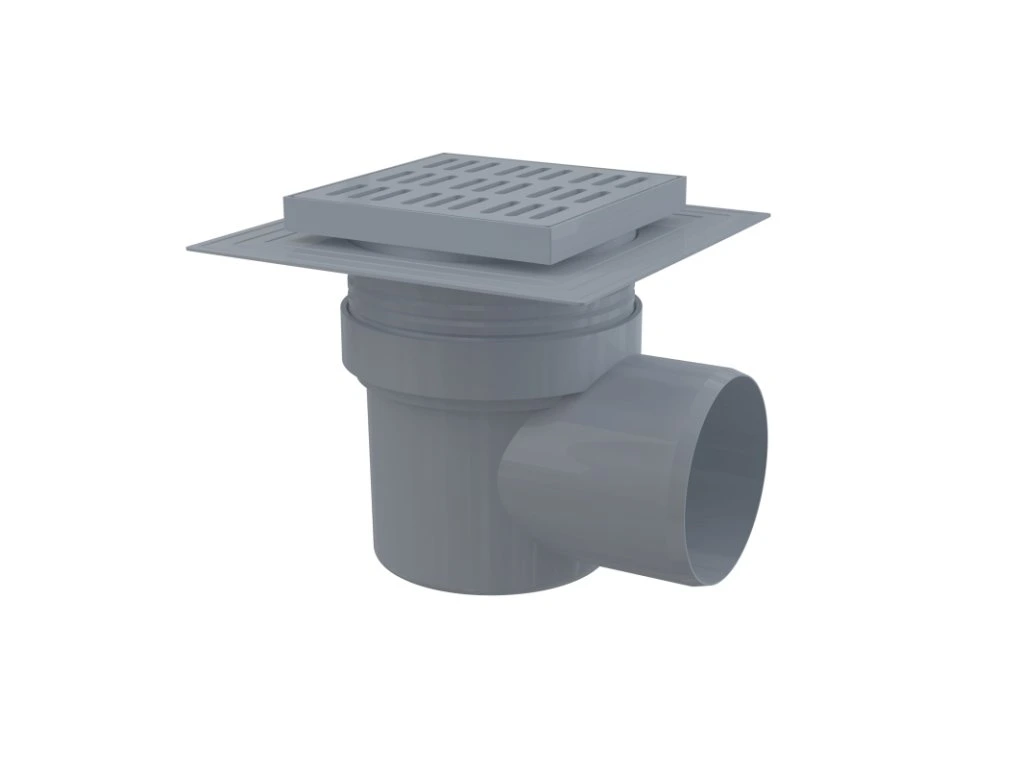 ALCA Podlahová vpust 150×150/110 mm boční, mřížka šedá, límec 2. úrovně izolace, vodní zápachová uzávěra APV10