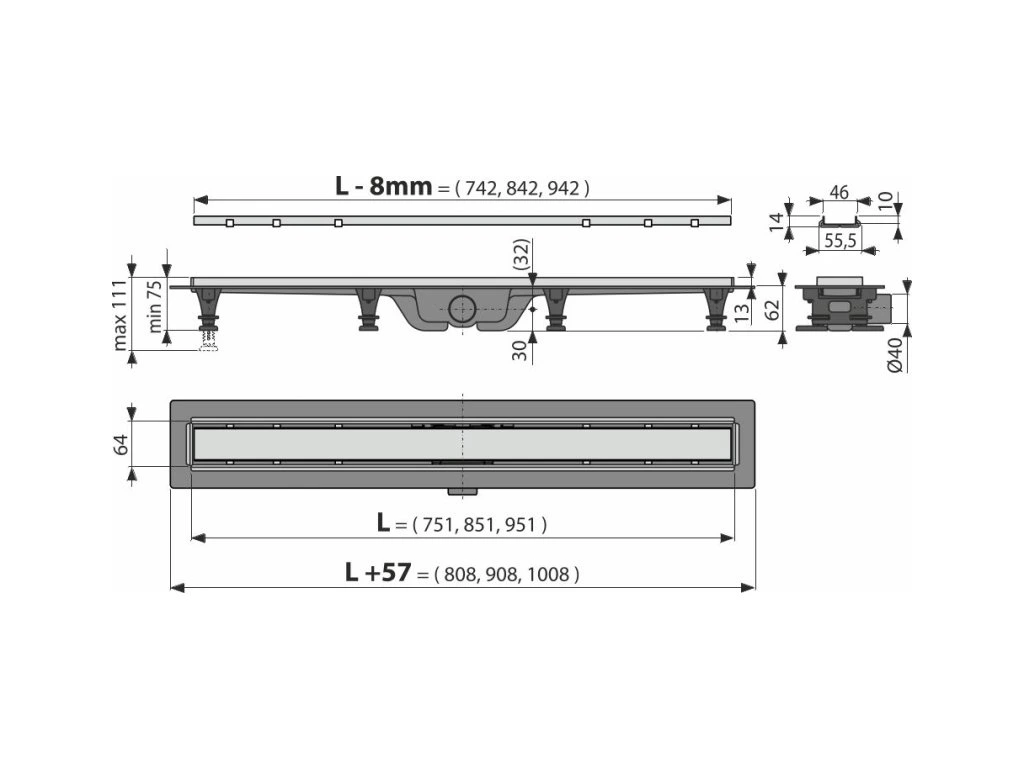 ALCA Podlahový žlab s nerezovým okrajem pro oboustranný rošt APZ20-850