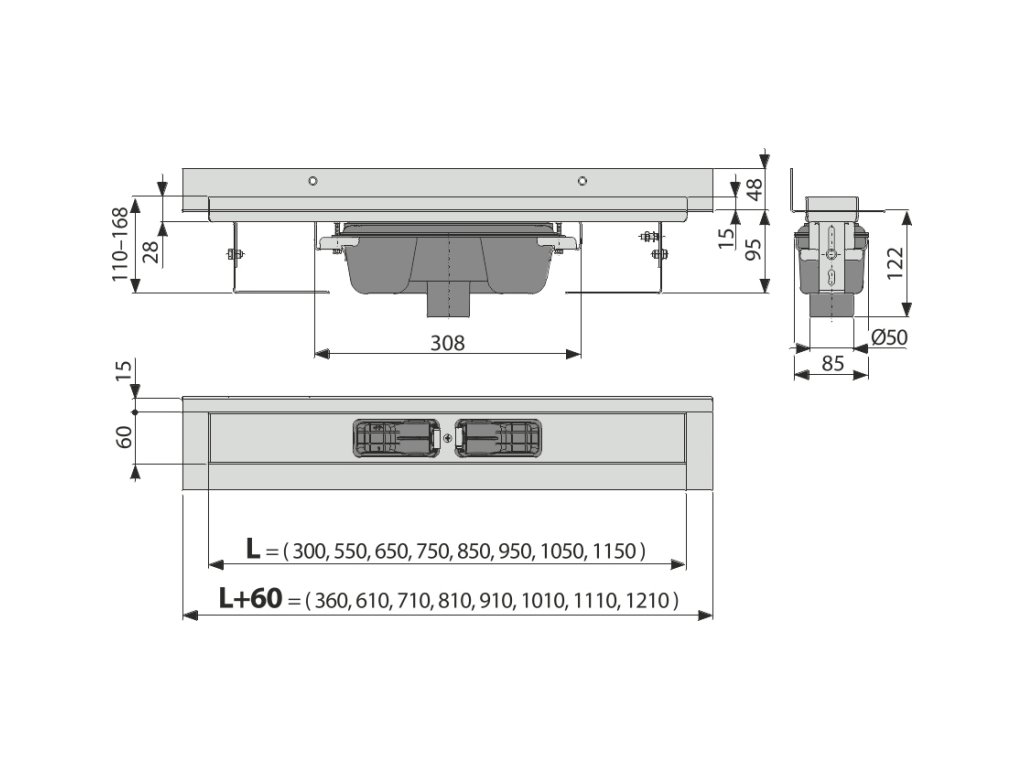 ALCA Podlahový žlab s okraje m pro plný rošt a s pevný m límce m ke stěně, svislý odtok APZ1016-300