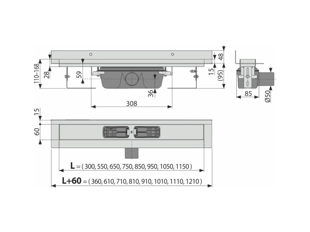 ALCA Podlahový žlab s okraje m pro plný rošt a s pevný m límce m ke stěně APZ16-950