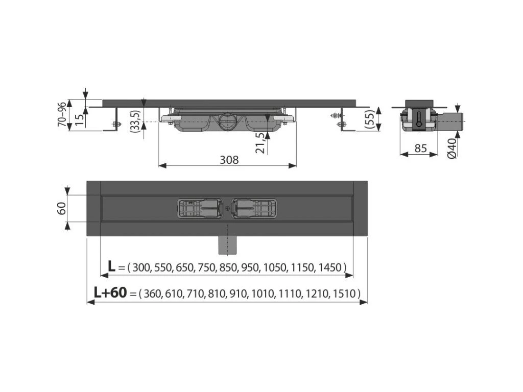 ALCA Podlahový žlab s okrajem pro perforovaný rošt, černá-mat APZ101BLACK-950