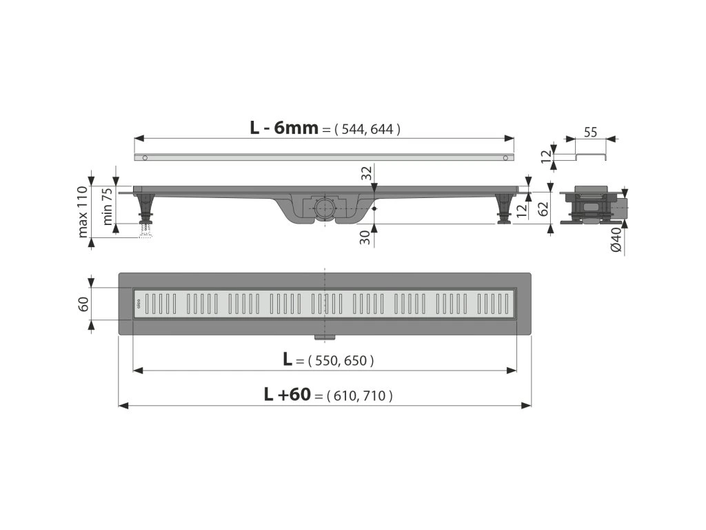 ALCA Podlahový žlab s okrajem pro perforovaný rošt APZ10-650M