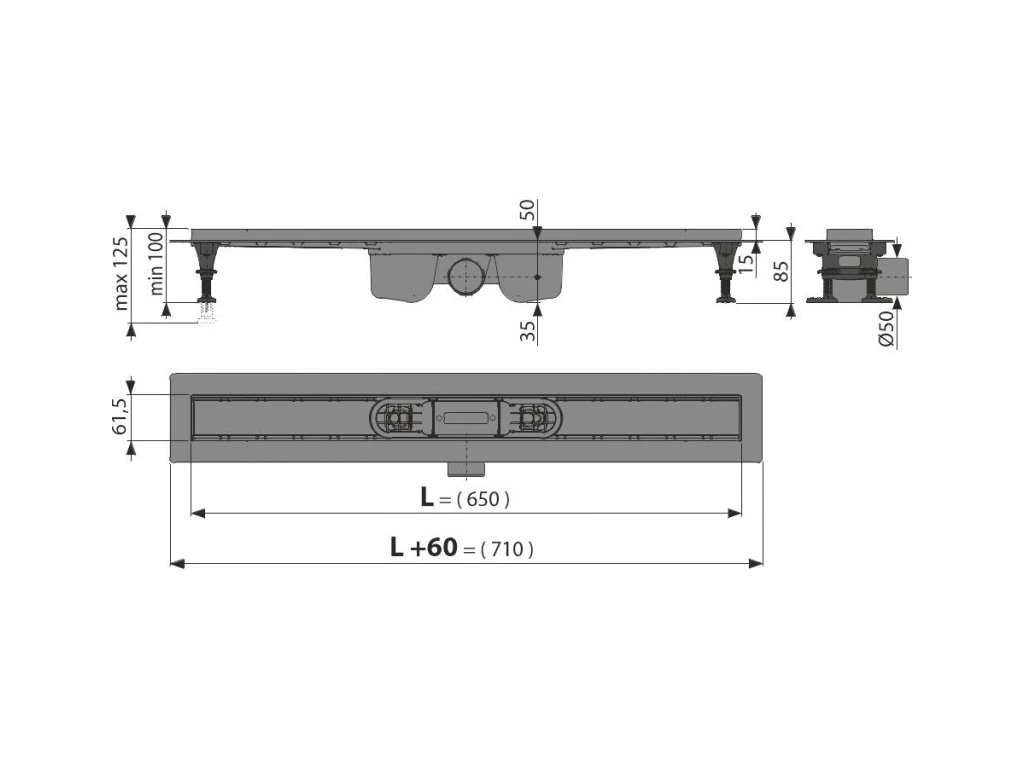 ALCA Podlahový žlab s okrajem pro perforovaný rošt nebo vložení dlažby APZ12-650