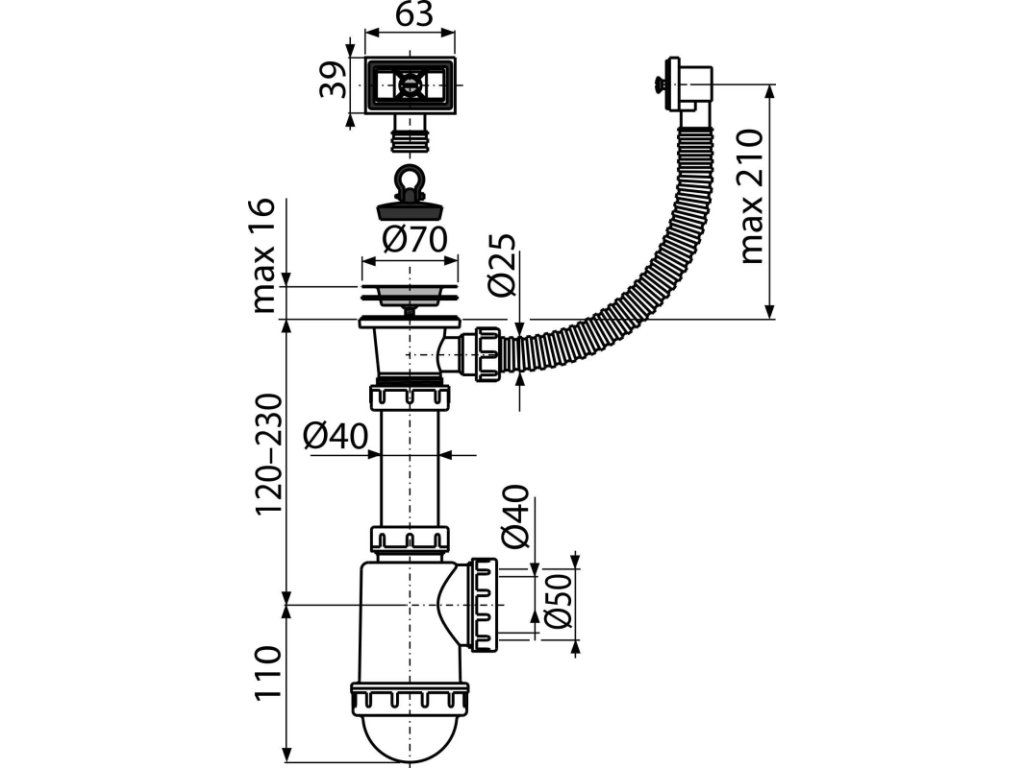 ALCA Sifon dřezový DN 40/50 s nerezovou mřížkou Ø 70 mm a flexi přepadem, pryžová zátka A444-DN50/40