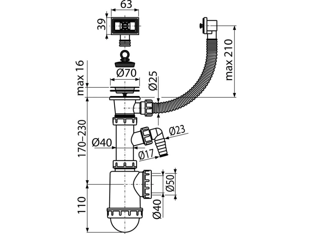 ALCA Sifon dřezový DN 40/50 s přípojkou Ø 17–23 mm, nerezovou mřížkou Ø 70 mm a flexi přepadem, pryžová zátka A444P-DN50/40