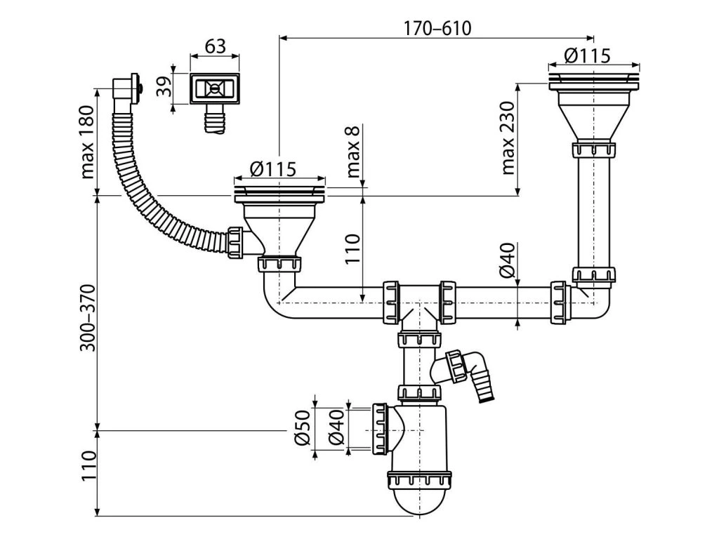 - Pro dvoudílné dřezy s rozdílnou hloubkou a přepadem