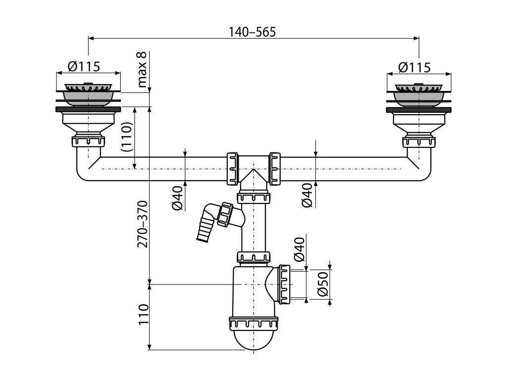 - Vývod odpadu připraven pro napojení odpadní trubky Ø50 nebo Ø40 mm
