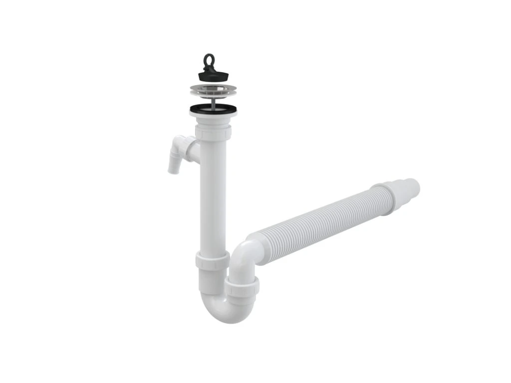 ALCA Sifon trubkový dřezový DN 50/40 přípojkou Ø 17–23 mm a nerezovou mřížkou Ø 70 mm a flexi hadicí, pryžová zátka A830-DN50/40