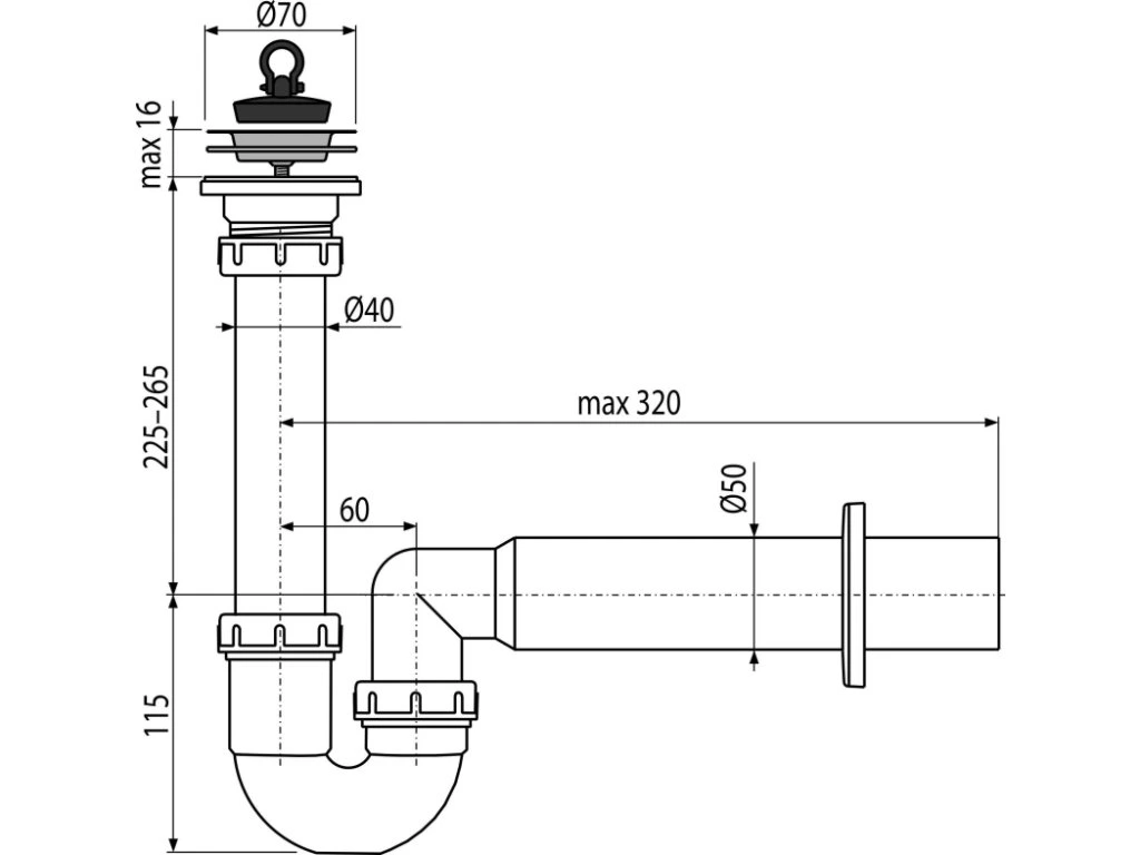 ALCA Sifon trubkový dřezový DN 50 s nerezovou mřížkou Ø 70 mm, pryžová zátka A800-DN50