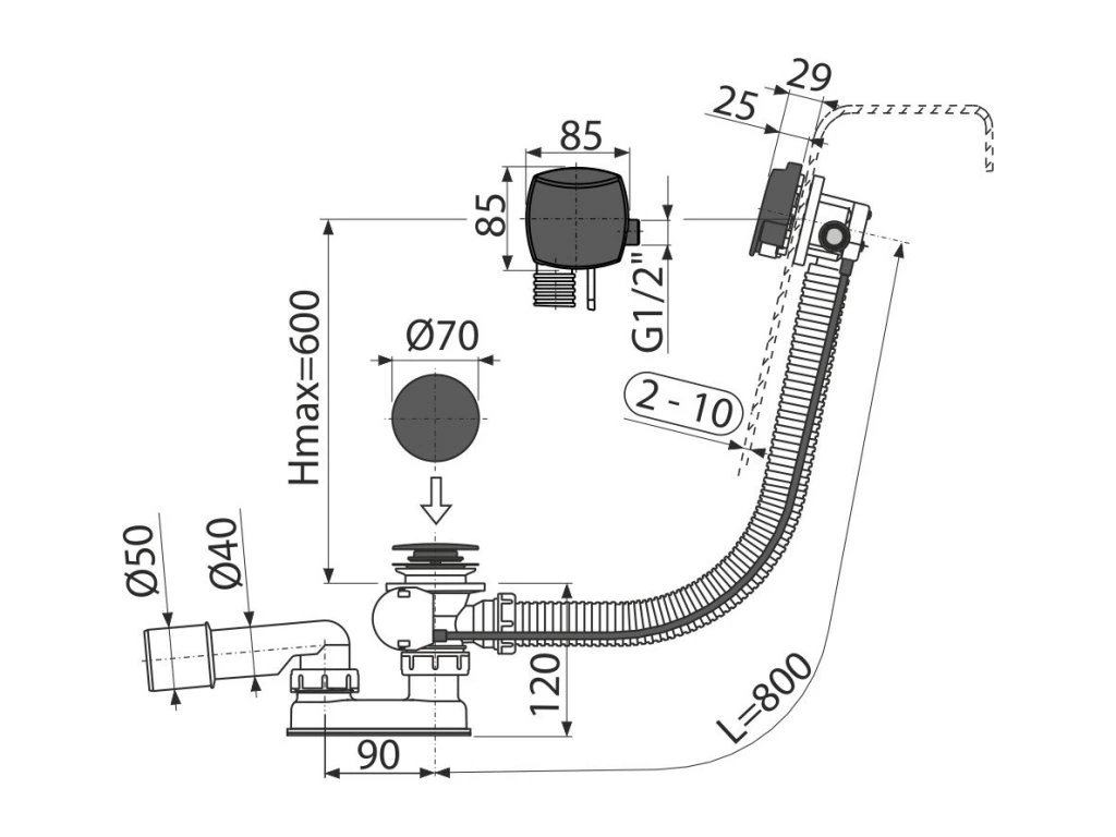 ALCA Sifon vanový automat s napouštěním přepadem, délka 80 cm, kov, černá-mat A564BLACK-80