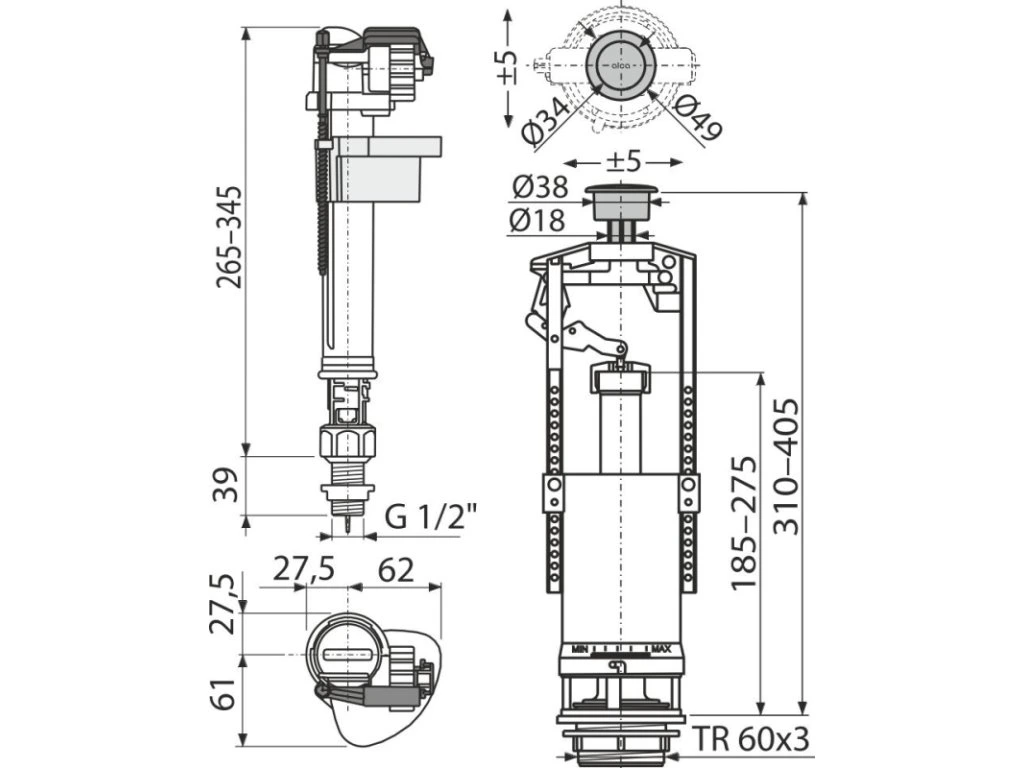 - Konstrukce umožňuje seřízení optimální výšky ventilu dle výšky nádržky