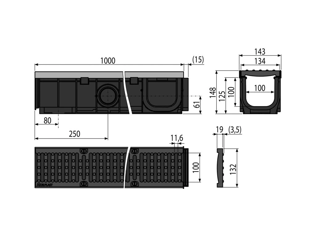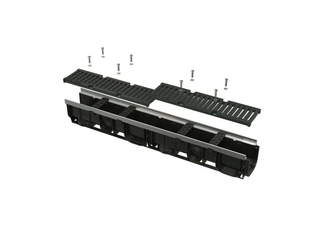 - Rošt litinový – fixovaný ve žlabu pomocí osmi kusů nerezových šroubů, šířka vtokové štěrbiny 11,6 mm