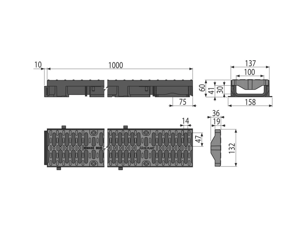 - Rošt kompozitní – fixovaný ve žlabu pomocí osmi kusů nerezových šroubů, šířka vtokové štěrbiny 14 mm