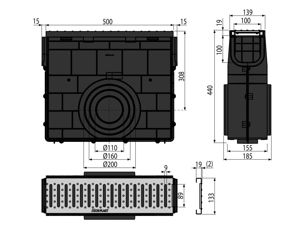 - Boční napojení na odpad Ø110, 160, 200 mm