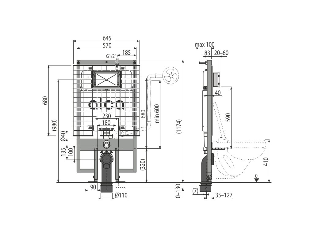 • Pro montáž závěsného WC s připojovací roztečí 180 mm nebo 230 mm