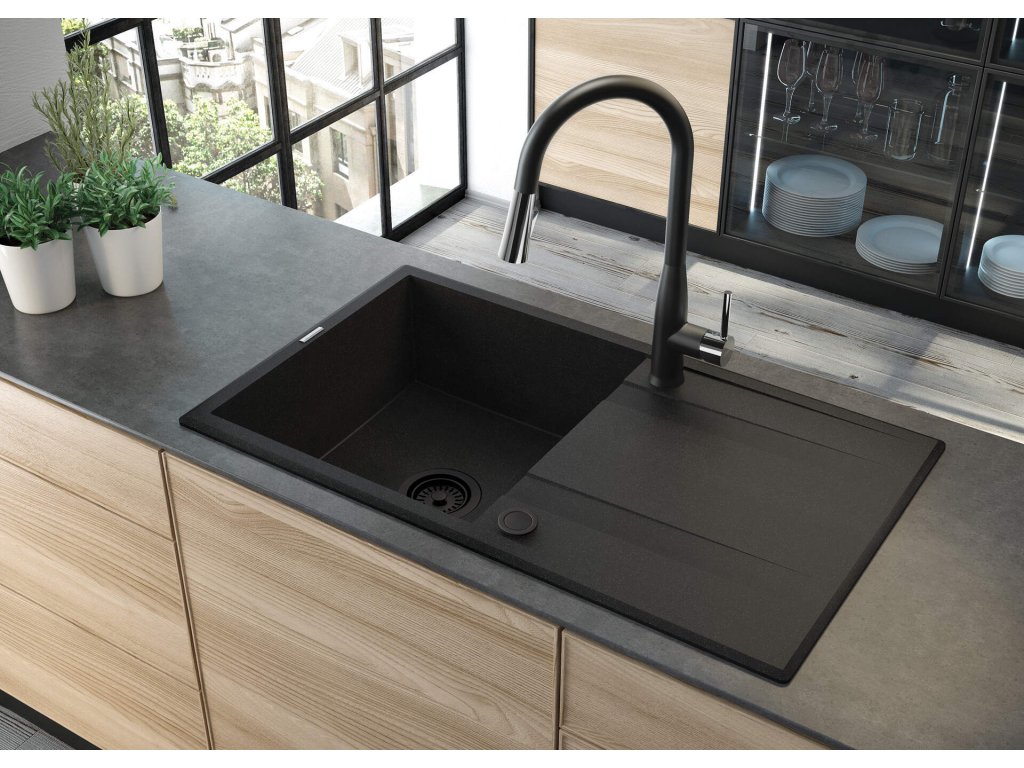 Granitový dřez Eridan je vyroben z nejkvalitnějšího přírodního žulového kompozitu. Vyznačuje se odolností proti nárazu, vysokým teplotám a rychlým změnám teploty v souladu s evropskou normou EN 13310. Estetický povrch se nebarví a neztrácí lesk. Dokonale se kombinuje s dřevěnými a kamennými pracovními deskami. Praktický dřez s jednou mísou a odkapávačem je ideálním řešením pro malé kuchyně a studia s přístavbou. Zároveň slouží jako odkapávač; profilovaný povrch účinně odvádí vodu z nádobí nebo umytých potravin.