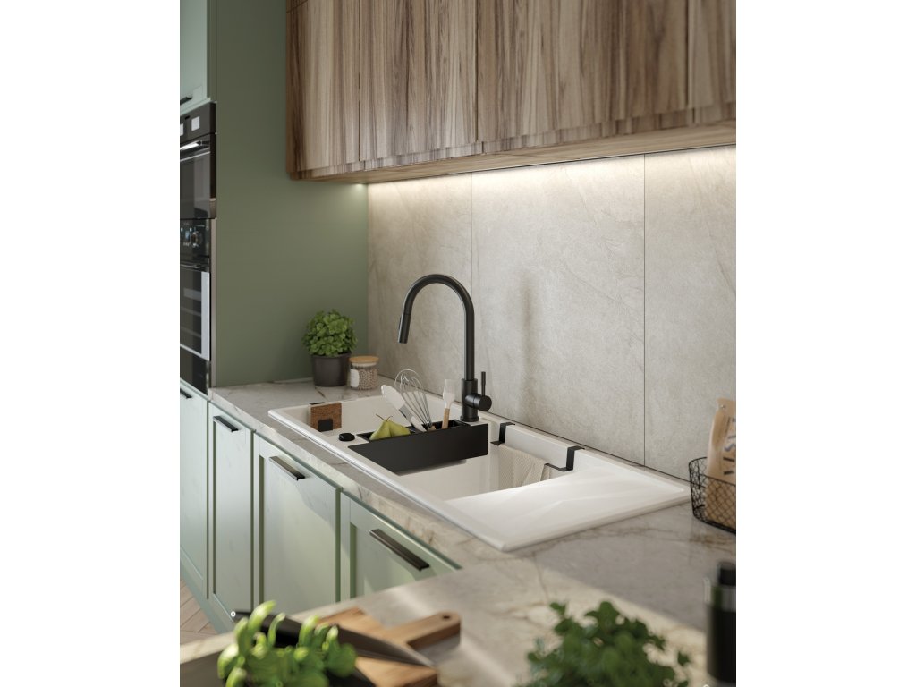 Granitový dřez Magnetic s jednou mísou v krásné elegantní alabastrové barvě, která se dokonale hodí do světlých kuchyní, je moderní dřez s magnetickými vlastnostmi, které jsou pro uživatele na první pohled neviditelné. Dřezy z autorské kolekce Magnetic jsou vybaveny magnety, díky nimž lze na bok mísy umístit ocelovou mřížku. Elegantní rámeček odděluje mísu od boční poličky, čímž vzniká další prostor, který zvyšuje funkčnost dřezu a umožňuje jeho vybavení specializovaným příslušenstvím z kolekce - hygienickými držáky na utěrku a myčku nebo praktickými košíky s odkapávačem. Dřez pod omítku má prostornou mísu a velký odkapávač upoutá pozornost dekorativním motivem rybí kosti, který urychluje odtok vody.