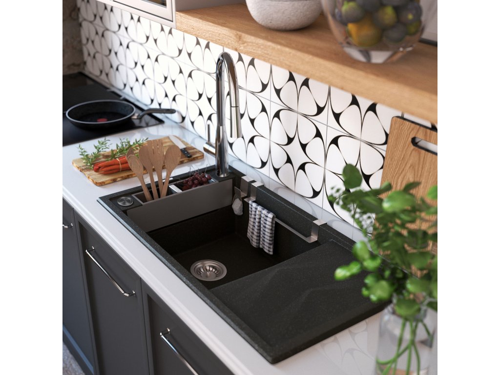 Granitový dřez Magnetic má magnetické vlastnosti, které mu umožňují rychle uspořádat prostor s užitečným příslušenstvím - bez dalšího upevnění. Jedná se o model s jednou objemnou mísou a praktickou odkapávací deskou s motivem rybí kosti, která urychluje odtok vody. Dřez je vybaven magnety, díky nimž lze na bok mísy umístit ocelový kryt. Elegantní rámeček odděluje mísu od boční poličky, kterou lze použít například na sušení příborů.