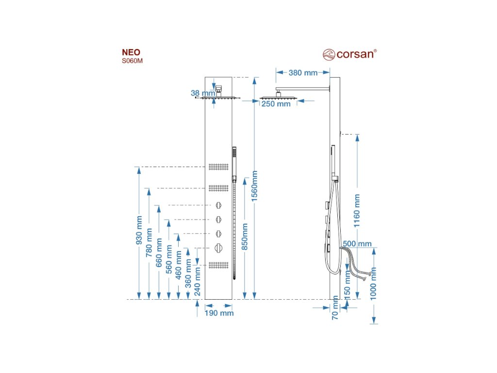 Díky kombinaci nerezové oceli, odolné mosazi, hliníku a a keramiky je sprchový panel Neo prakticky bezporuchový. Použitím speciální technologie Saving došlo ke snížení nadměrné spotřeby a proto je tento panel vysoce efektivní a zároveň ekonomický produkt. Korpus masážního panelu je vyroben z bambusového dřeva, které prošlo přísným výběrem. Každý jediný kus je originální a jedinečný, díky preciznímu zpracování. Panel je finálně ošetřeno ochranným lakem. Masážní panel Neo Vám poskytne masáž, dešťovou sprchu a ruční sprchu.