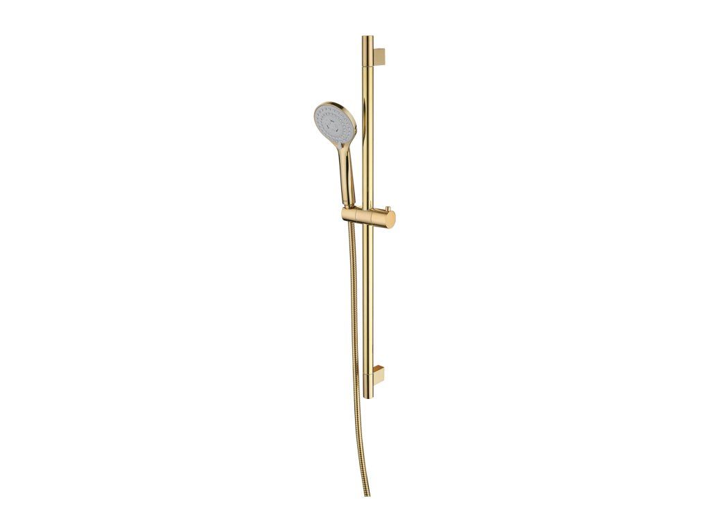 Moderní zpracování ručního posuvného sprchového setu ve zlaté barvě je vhodným doplňkem do designově laděných koupelen.