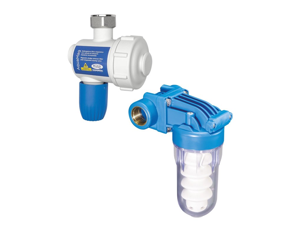 AQUAMAG - Magnetický filtr s integrovaným uzavíracím vstupním ventilem a výstupní zpětnou klapkou, vybaven magnetem a nerezovou filtrační vložkou pro zachytávání magnetických nečistot. Určen pro instalaci do potrubí topného systému. vysoký účinek zachytávání magnetických nečistot (magnet o síle 11 000 Gauss) minimální rozměry, jednoduchá instalace AQUACAL - Filtr s proporcionálním dávkováním polyfosfátového roztoku do technických vodních okruhů (dopouštění topných systémů, pro pračky, myčky atd.), Polyfosfátový roztok vznikne manuálním smícháním vody a polyfosfátového přášku ve spodní nádobce. Součástí filtru je polyfosfátová náplň pro opakované doplnění.Doplňkové parametry