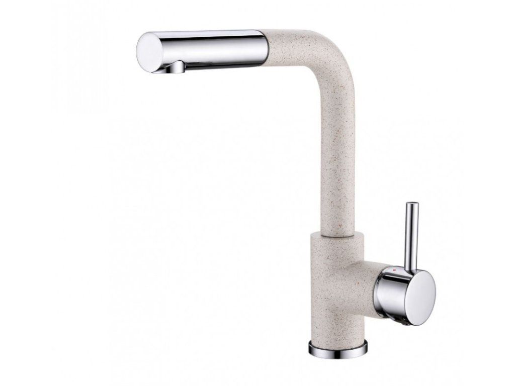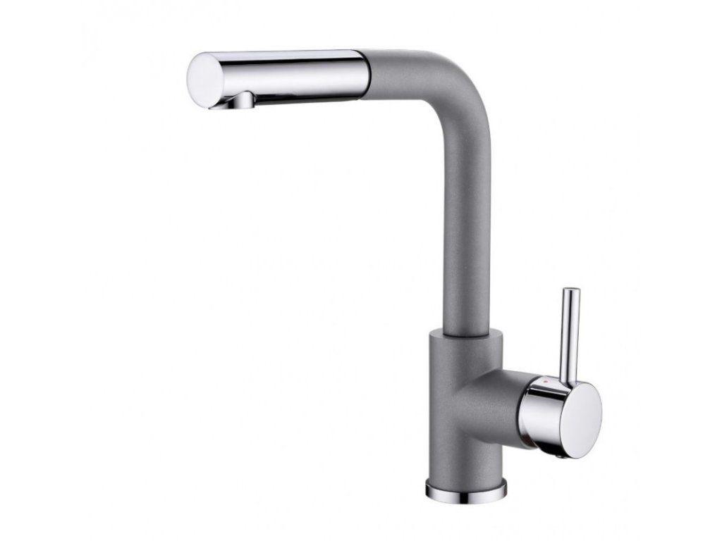 Povrch dřezové baterie je vyroben z drcené žuly. Černá granitová baterie, ale také písková, bílá nebo šedá skvěle doplní granitový dřez v podobných odstínech. Samozřejmě je možné tuto pákovou baterii použít i u dřezů nerezových, kde ozvláštní celkový dojem mycího centra.