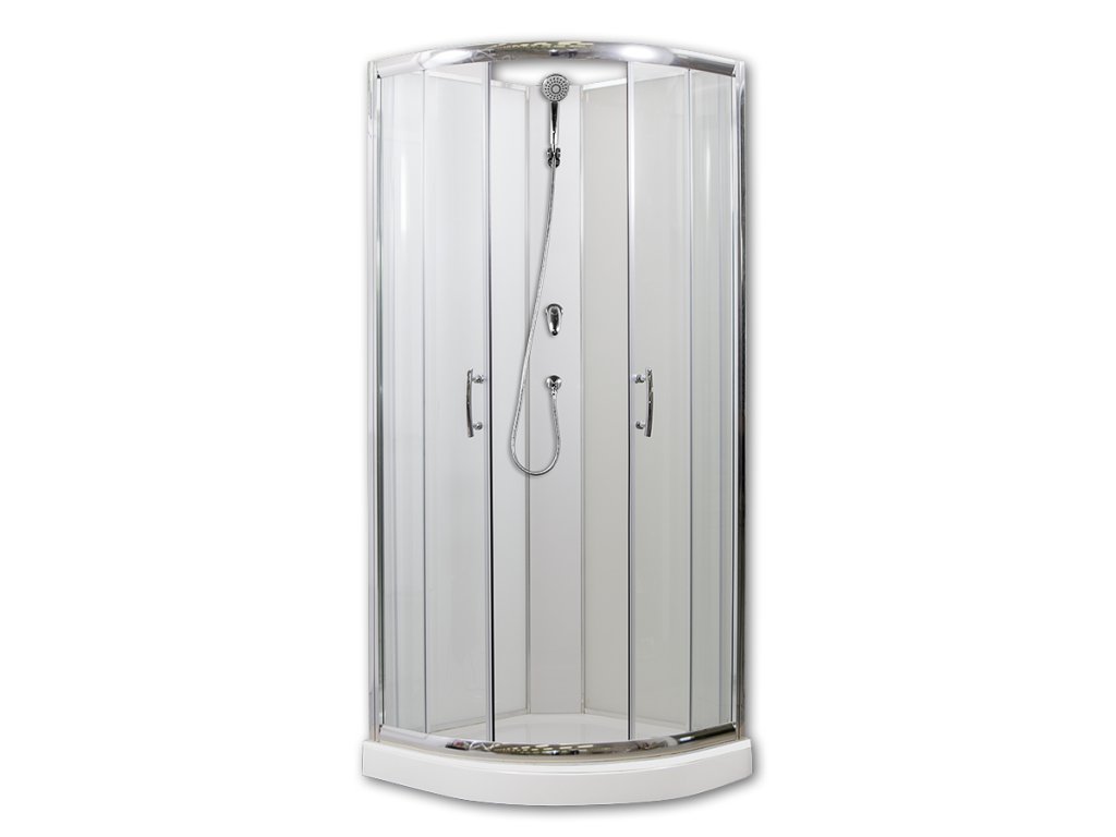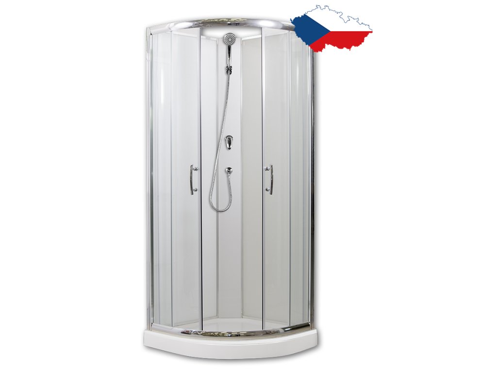 Sprchový box ARTTEC BRILIANT 80 MODEL 1 clear, vlastní výroby, s posuvnými dveřmi čtvrtkruhový se vyznačuje vysokou kvalitou a jednoduchým designem. Nabízí vše, co potřebujete k pohodlnému každodennímu sprchování: baterii, ruční sprchu s držákem a vaničku z litého mramoru.
