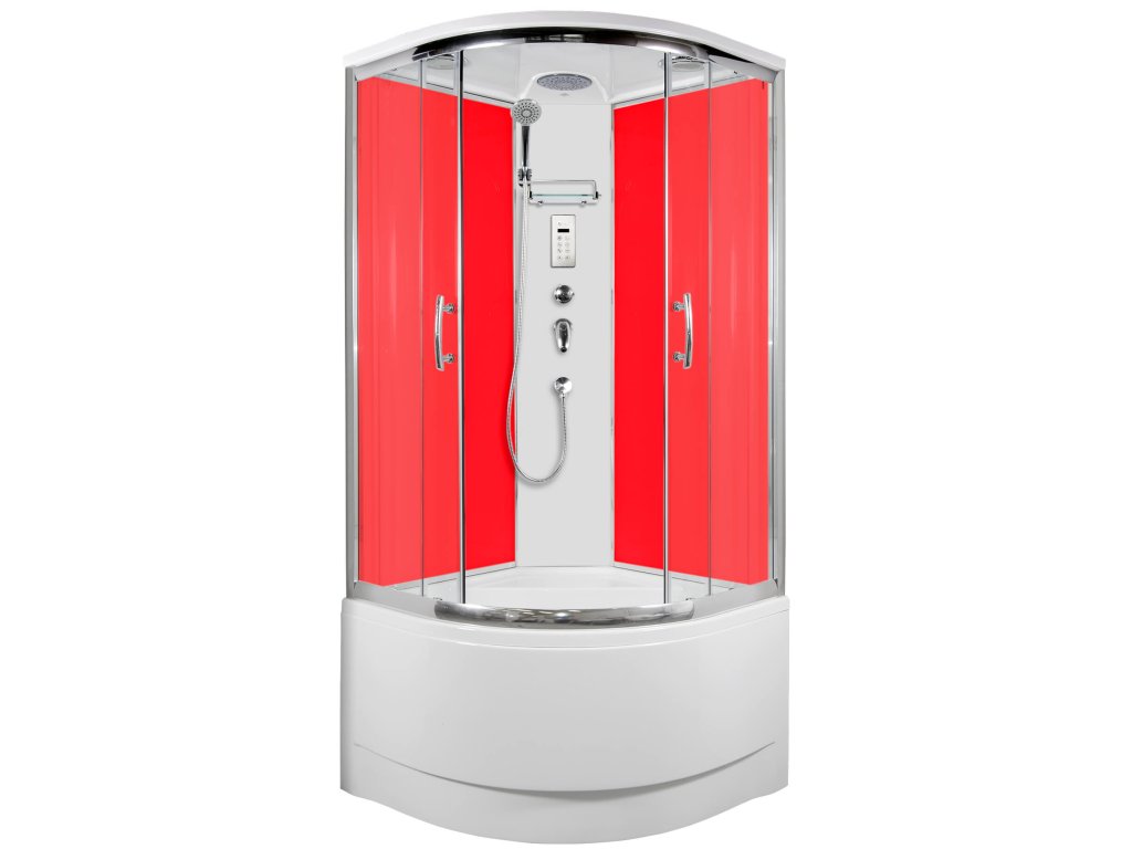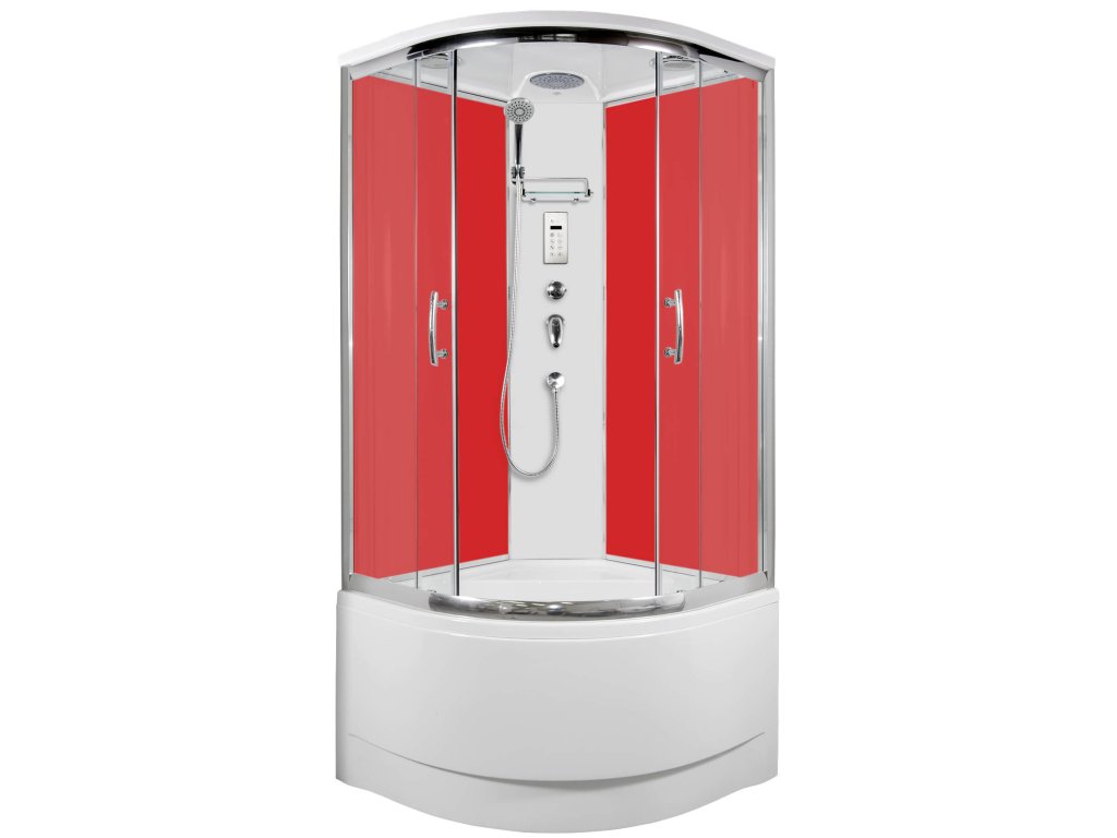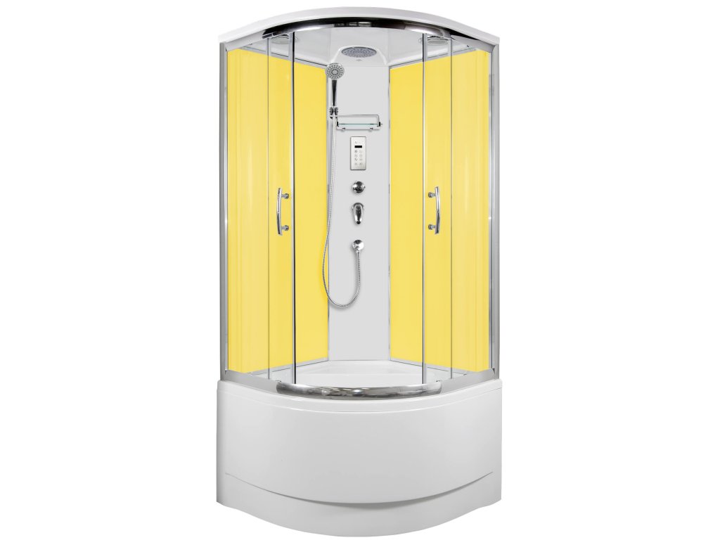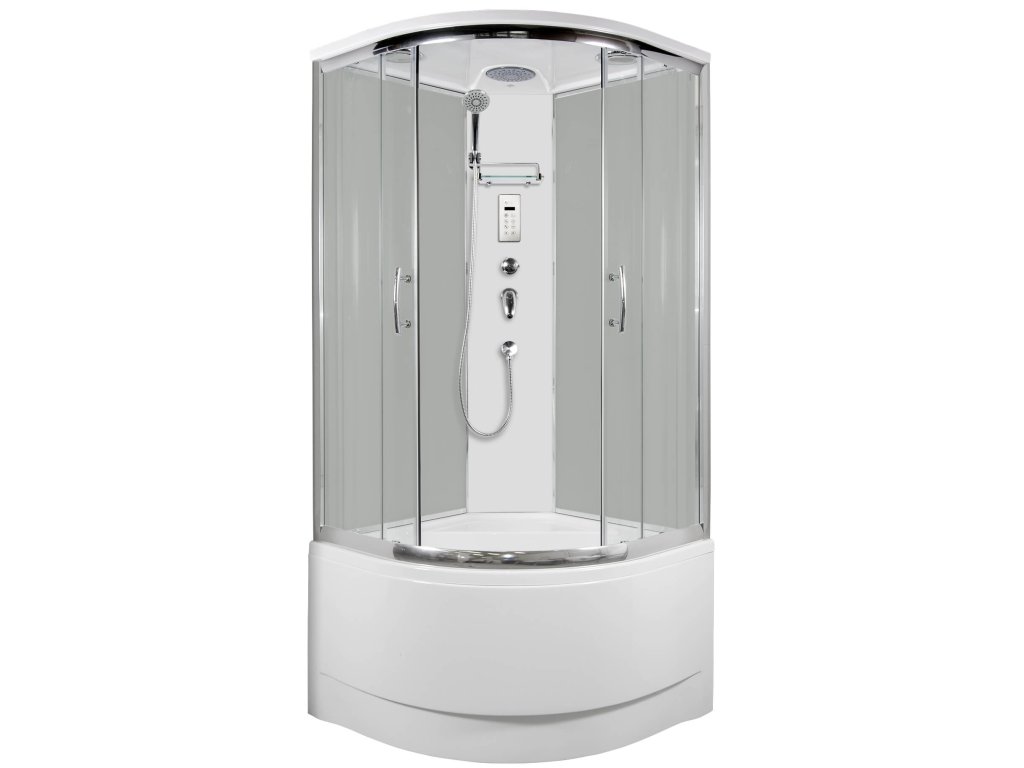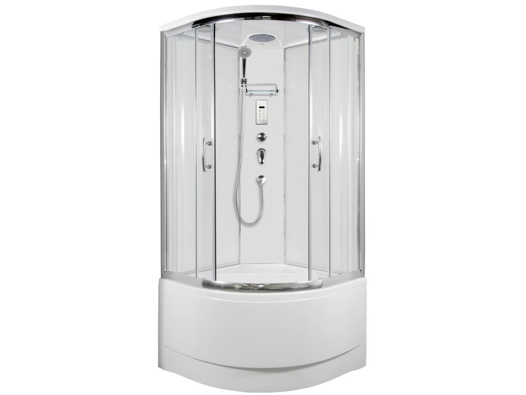 Klasický čtvrtkruhový sprchový box vlastní výroby s posuvnými dveřmi se vyznačuje jednoduchým designem, vysokou kvalitou zpracování. Profil je z leštěného hliníku, prosklení z 5 mm bezpečnostního grape skla, zadní sklo super bílé neprůhledné, šířka vstupu 53 cm. Vysoká vanička, vlastní výroby, v bílé barvě je umístěna na pevném ocelovém rámu se stavěcími nožičkami. Výroba panelu, předního panelu k vaničce a stropu je nyní z kompozitních materiálů, které se používají v leteckém průmyslu. Vůči dříve používané polyesterové pryskyřici je kompozitní materiál ekologičtější, lépe zpracovatelný a při stejné tloušťce výrobku pevnější. Je to také důvod, proč můžeme dosáhnout tak dokonalé povrchové úpravy.