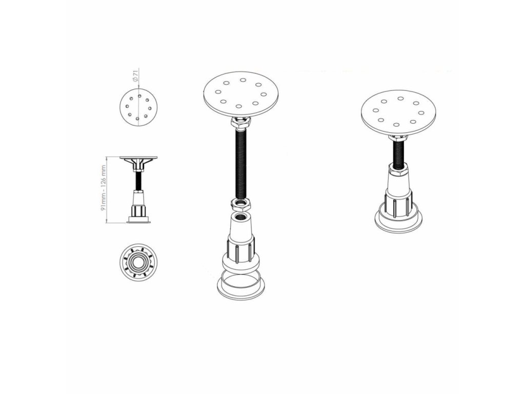 Výškově nastavitelné nohy pro vaničky z litého mramoru. Pojištění nastavené výšky zajišťuje aretační matka.