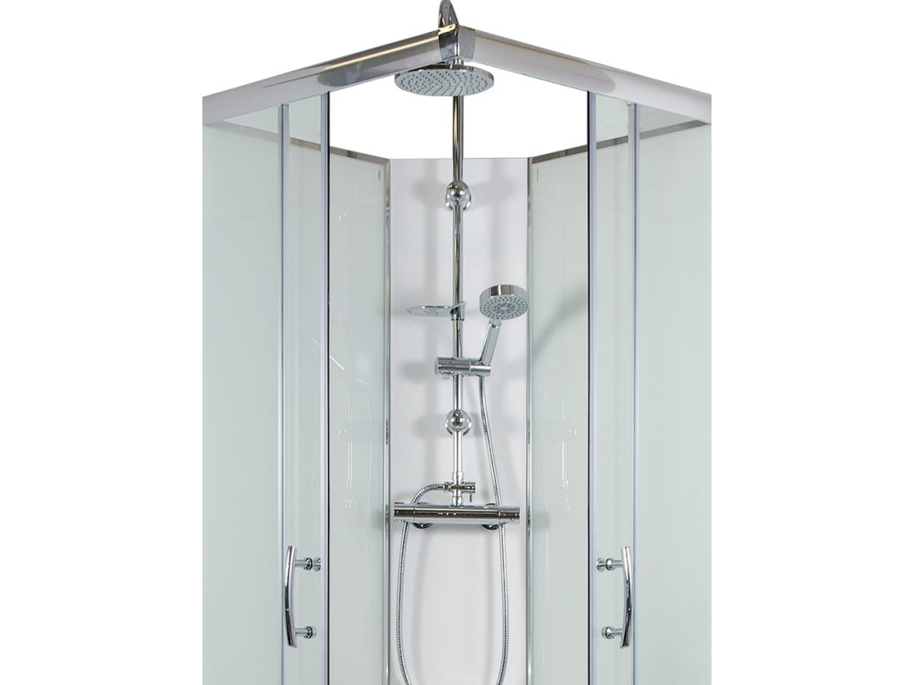 Sprchový box ARTTEC SMARAGD TERMO MODEL 6 clear, vlastní výroby, s posuvnými dveřmi čtvercový se vyznačuje vysokou kvalitou a jednoduchým designem. Pro komfortní sprchování nabízí ve výbavě TERMO SET, který se skládá z TERMO baterie, ruční sprchy na posuvném držáku, horní sprchy a mýdlenky. Součástí sprchového boxu je také polička na šampon a vanička z litého mramoru.
