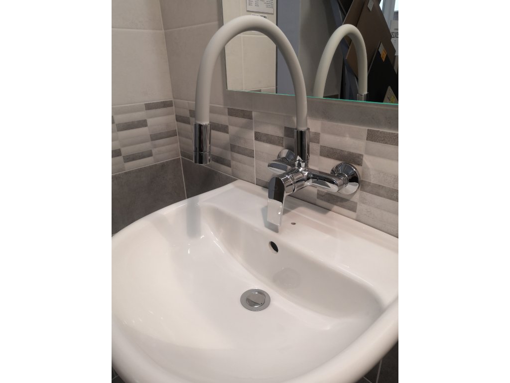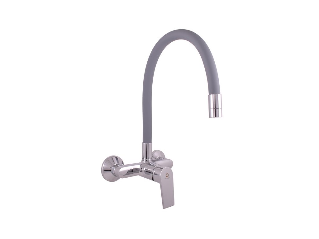 Vodovodní baterie dřezová nástěnná s flexibilním otočným ramínkem.