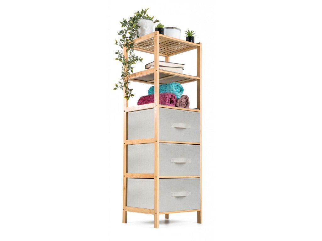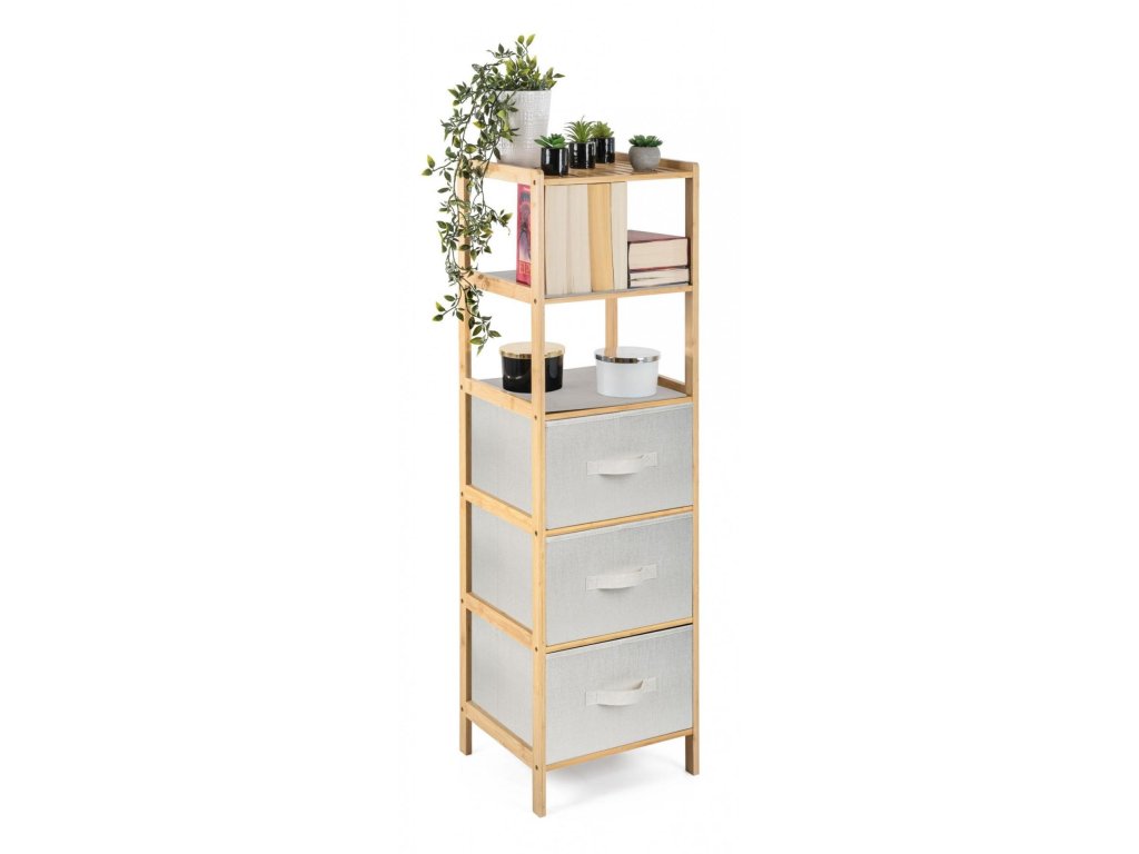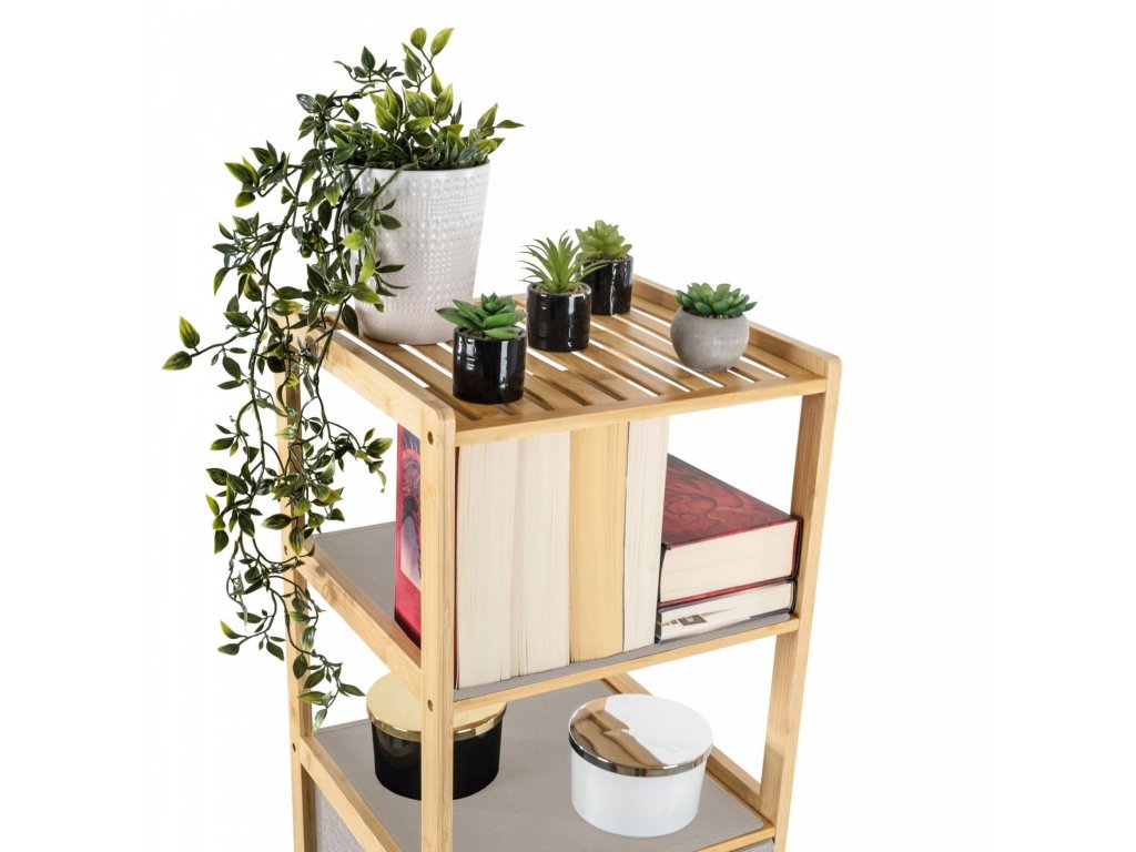 Bambusový regál s výsuvnými látkovými zásuvkami dodává interiéru příjemný přírodní dojem, pocit lehkosti a přirozenosti, zatímco jeho pevnost a dlouhá životnost zajišťují stabilitu a trvanlivost.