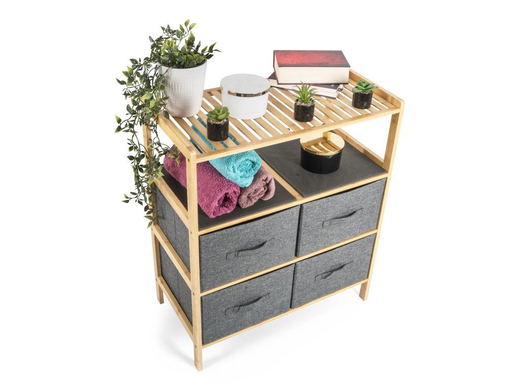 Bambusový regál s výsuvnými látkovými zásuvkami dodává interiéru příjemný přírodní dojem, pocit lehkosti a přirozenosti, zatímco jeho pevnost a dlouhá životnost zajišťují stabilitu a trvanlivost.