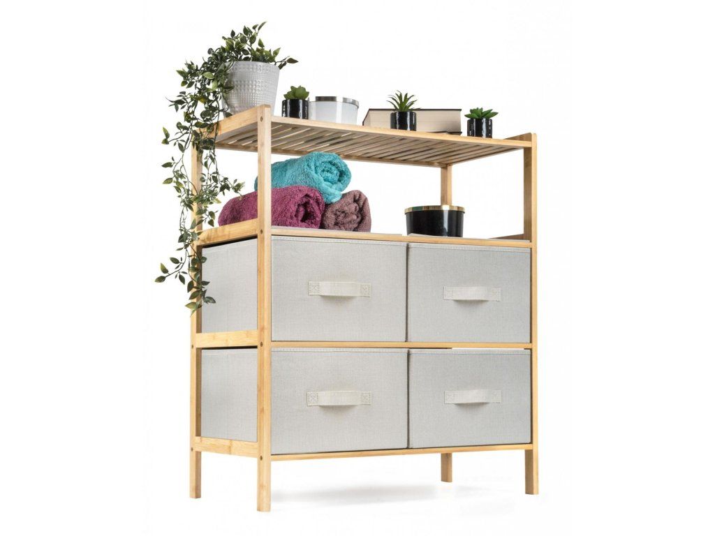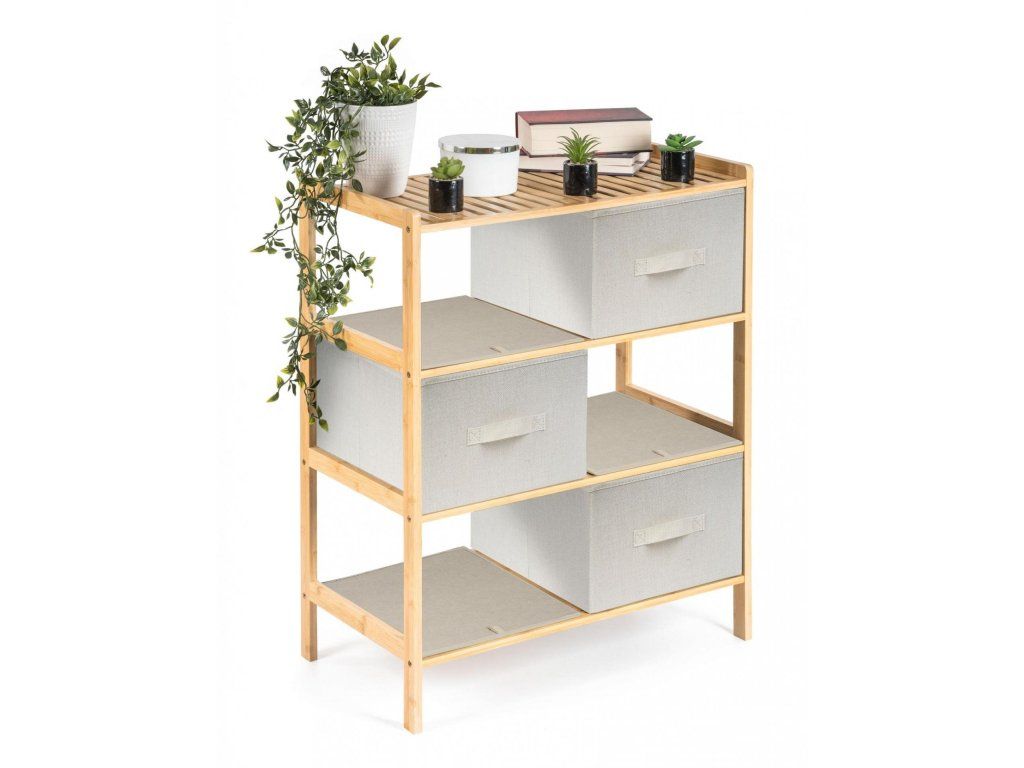 Bambusový regál s výsuvnými látkovými zásuvkami dodává interiéru příjemný přírodní dojem, pocit lehkosti a přirozenosti, zatímco jeho pevnost a dlouhá životnost zajišťují stabilitu a trvanlivost.