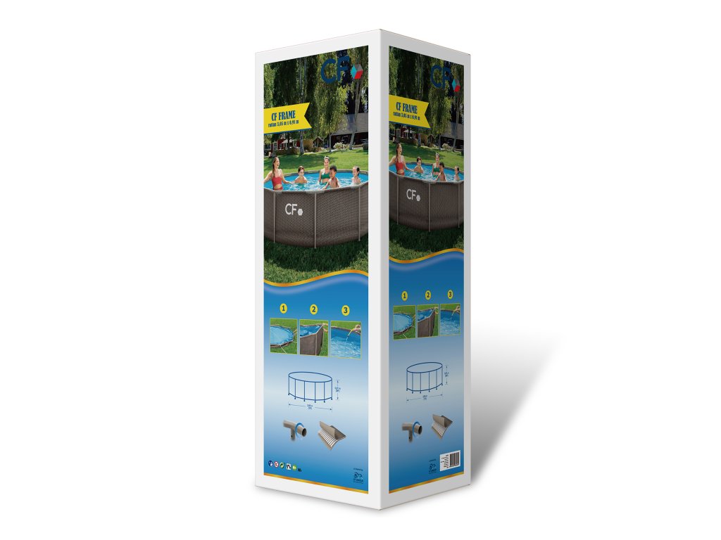 CF FRAME 305 × 91 cm je rámový nadzemní bazén určený pro zákazníky, kteří chtějí pevnější a stabilnější řešení než samonosné modely. Základem je kovová trubková konstrukce z oceli, která drží tvar bazénu i při plném napuštění. Zavěšená bazénová fólie je vyrobena z trojvrstvého PVC materiálu – kombinace dvou odolných vrstev a vnitřní výztužné síťoviny zajišťuje dlouhou životnost, vyšší odolnost proti protržení a stabilitu při zatížení. Výška 91 cm poskytuje větší objem vody (5,8 m³) a komfortnější koupání než nižší modely. Díky tomu je bazén vhodný nejen pro děti, ale i pro dospělé. Montáž je jednoduchá a nevyžaduje žádné nářadí. Konstrukce do sebe zapadá pomocí spojovacích prvků a bazén je připraven k napuštění během 15–20 minut. Důležité je pouze připravit rovný, pevný a zhutněný podklad. Bazén je vybaven průchodkami stěnou pro připojení filtrace (32/38 mm). Filtrace ani hadice nejsou součástí balení. Po sezóně lze bazén snadno demontovat, vysušit a uložit do suchého prostoru. Klíčové vlastnosti:Rámová ocelová konstrukce pro vysokou stabilitu Trojvrstvá zesílená PVC fólie Výška 91 cm – větší komfort při koupání Objem 5,8 m³ Montáž bez nářadí Připraven ke koupání cca za 15–20 minut Připojení filtrace 32/38 mm Vhodný pro sezónní použití 5 vychytávek, které oceníte:Vyšší konstrukce 91 cm. Více vody znamená pohodlnější koupání i pro dospělé. Stabilní ocelový rám. Drží pevný tvar bez deformací při naplnění. 3vrstvá zesílená stěna. Odolnost proti protržení, UV záření i běžné bazénové chemii. Montáž bez nářadí. Jednoduchý systém spojů – žádné šroubování. Standardní připojení filtrace. Možnost napojení běžné kartušové nebo pískové filtrace.5 důvodů, proč zvolit CF FRAME:Vyšší stabilita než u samonosných bazénů Větší hloubka vody (91 cm) pro komfortnější koupání Zesílená fólie (0,52 mm stěna) pro delší životnost Snadná montáž bez speciálního nářadí Zázemí profesionálního bazénového prodejce se servisem a náhradními dílyTechnické parametry:ParametrHodnotaTyp bazénuRámový (trubková konstrukce)Průměr305 cmVýška91 cmObjem vody5,8 m³Materiál stěny3vrstvé PVCTloušťka stěny0,52 mmTloušťka dna0,28 mmBarvavnitřní modrá / vnější ratanMontáž bez nářadíAnoPřipojení filtrace32 / 38 mmFiltrace součástíNeKrytNeŽebříkNePodložkaNeUrčeno pro zabudováníNe Obsah baleníKonstrukce bazénu (ocelový rám) Bazénová fólie Průchodky stěnou Návod k montáži (Filtrace, hadice, plachta ani žebřík nejsou součástí balení.) Pro koho je bazén určenPro rodiny, které chtějí pevnější konstrukci než u nafukovacích bazénů Pro uživatele, kteří chtějí vyšší hladinu vody (91 cm) Pro sezónní využití bez stavebních úprav Pro zákazníky, kteří chtějí snadnou montáž bez složité instalace Přehled bazénů CF – rychlý výběr podle velikosti, hloubky a komfortuModelTyp konstrukceRozměr (cm)Hloubka vodyObjem vodyProstor na zahraděIdeální proNáročnost montážeCF QUICK 305 × 76 (ratan)Samonosný (nafukovací prstenec)305 × 7676 cm4 m³MalýDěti, rychlé létoNejrychlejší (10 min)CF FRAME 305 × 76Rámový (ocelová konstrukce)305 × 7676 cm4,8 m³MalýRodina s malými dětmi15–20 minCF FRAME 305 × 91Rámový305 × 9191 cm5,8 m³Malý až středníRodina15–20 minCF FRAME 305 × 107Rámový305 × 107107 cm6,7 m³StředníDěti + dospělí15–20 minCF FRAME 366 × 132 (ratan)Rámový366 × 132132 cm13,8 m³Větší zahradaRodina, částečné plavání20 minCF FRAME 457 × 132 (ratan)Rámový – vrcholný model457 × 132132 cm21 m³Velká zahradaVelká rodina20 min Závěrečné shrnutí CF FRAME 305 × 91 cm je stabilní, odolný a přitom snadno instalovatelný nadzemní bazén pro celou rodinu. Díky pevné ocelové konstrukci a zesílené PVC fólii nabízí vyšší jistotu a delší životnost než základní modely. Při nákupu od specializovaného bazénáře získávátedostupné náhradní díly servisní podporu odborné poradenství kompatibilní příslušenství Bazén je sezónní investice na několik let – vyplatí se zvolit kvalitu a zázemí, které vám bude k dispozici i po nákupu.Doplňkové parametry