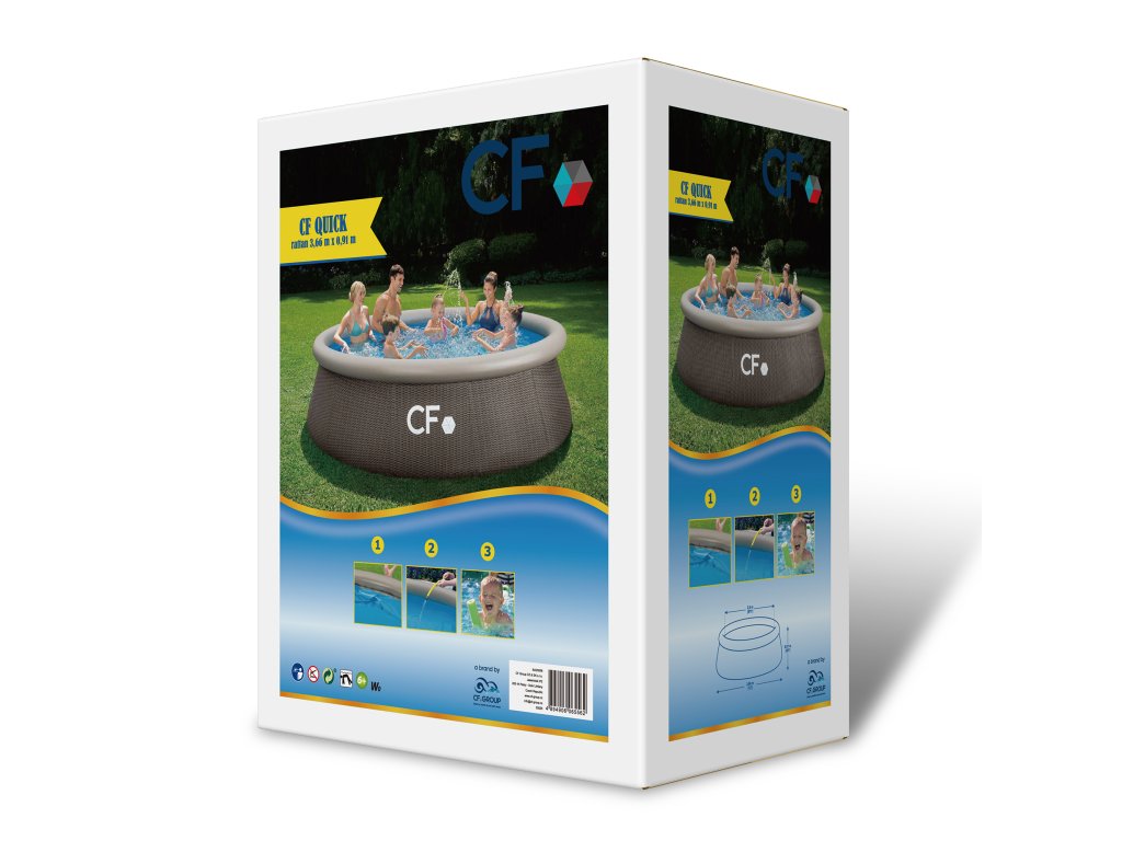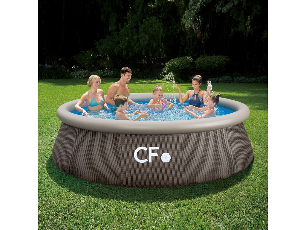 CF QUICK 366 × 91 cm patří mezi nejprodávanější nadzemní bazény v České republice – a není to náhoda. Jedná se o samonosný kruhový bazén s nafukovacím prstencem, který se postaví sám tlakem napouštěné vody. Instalace je jednoduchá a zvládne ji jedna osoba. Stačí připravit rovný podklad, rozložit bazén, nafouknout horní prstenec a začít napouštět vodu. Stoupající voda postupně zvedne stěny do finální polohy. Bazén je vyroben ze super pevného třívrstvého PVC materiálu, který kombinuje vysokou odolnost proti protržení, UV stabilitu a dlouhou životnost. Vnější ratanový dekor dodává bazénu elegantní vzhled, který působí přirozeně a zapadne do moderní zahrady. Vnitřní část je klasicky modrá pro čistý a příjemný vzhled vody. Díky absenci pevných konstrukčních prvků je bazén bezpečnější pro děti (vždy však pod dohledem dospělé osoby). Po sezóně jej lze jednoduše vypustit, složit a uskladnit – bez složité demontáže kovových rámů. Bazén je vybaven průchodkami stěnou pro napojení filtrace (filtrace není součástí balení). Klíčové vlastnosti:Samonosný nadzemní bazén s nafukovacím prstencem Rychlá instalace bez nářadí Odolné 3vrstvé PVC stěny Moderní ratanový dekor Připraven ke koupání během několika minut Průchodky stěnou pro napojení filtrace Snadné zazimování a skladování Vhodný pro rodiny s dětmi5 vychytávek, které oceníte:Samonosná konstrukce bez kovového rámu. Žádné skládání konstrukce. Nafouknete prstenec a bazén se postaví sám. Prémiový ratanový dekor. Design, který působí luxusněji než běžné modré bazény. 3vrstvá zesílená PVC fólie. Vyšší odolnost proti protržení a mechanickému poškození. Připojení filtrace přes průchodky stěnou. Možnost napojení pískové nebo kartušové filtrace. Snadné skladování. Po sezóně jednoduše vypustíte, usušíte a složíte.V čem CF QUICK vyniká oproti konkurenci:Stejná výrobní linka jako přední značky – identická kvalita zpracování Prémiový ratanový dekor – moderní vzhled zahrady Silná 3vrstvá PVC konstrukce (0,55 mm stěna) Rychlá montáž bez nářadí – skutečně do 10 minut Nulové reklamace – ověřená kvalita bez kompromisů Zázemí silného bazénového specialisty s náhradními dílyTechnické parametry:ParametrHodnotaTyp bazénuSamonosný s nafukovacím prstencemPrůměr366 cmVýška91 cmObjem vodycca 6,9 m³Materiál3vrstvé PVCTloušťka stěny0,55 mmTloušťka dna0,28 mmBarvavnitřní modrá / vnější ratanPřipojení filtraceAno (průchodky stěnou)Filtrace součástíNeKrycí plachtaNeŽebříkNePodložkaNeUrčeno pro zabudováníNeObsah balení:Bazén CF QUICK 366 × 91 cm Průchodky stěnou Návod k instalaciJe vhodný pro:rodiny s dětmi majitele menších a středních zahrad zákazníky, kteří chtějí rychlou instalaci bez složité konstrukce uživatele, kteří chtějí moderní designKupujete od prověřeného bazénového specialisty, který má:servisní oddělení dostupné náhradní díly technickou podporu zkušenosti s tisíci instalacemiCF QUICK není jen další nafukovací bazén. Je to ověřená kvalita z výroby, která dodává i předním značkám. Přehled bazénů CF – rychlý výběr podle velikosti, hloubky a komfortuModelTyp konstrukceRozměr (cm)Hloubka vodyObjem vodyProstor na zahraděIdeální proNáročnost montážeCF QUICK 305 × 76 (ratan)Samonosný (nafukovací prstenec)305 × 7676 cm4 m³MalýDěti, rychlé létoNejrychlejší (10 min)CF FRAME 305 × 76Rámový (ocelová konstrukce)305 × 7676 cm4,8 m³MalýRodina s malými dětmi15–20 minCF FRAME 305 × 91Rámový305 × 9191 cm5,8 m³Malý až středníRodina15–20 minCF FRAME 305 × 107Rámový305 × 107107 cm6,7 m³StředníDěti + dospělí15–20 minCF FRAME 366 × 132 (ratan)Rámový366 × 132132 cm13,8 m³Větší zahradaRodina, částečné plavání20 minCF FRAME 457 × 132 (ratan)Rámový – vrcholný model457 × 132132 cm21 m³Velká zahradaVelká rodina20 min Závěrečné shrnutí: Bazén CF QUICK 366 × 91 cm je ideální volbou pro rodiny, které chtějí rychlé, cenově dostupné a přitom kvalitní řešení letního koupání.Doplňkové parametry