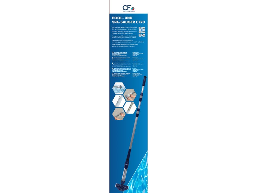 Ruční bazénový vysavač CF 20 AKU je praktickým pomocníkem pro každého, kdo chce udržovat svůj bazén nebo vířivku čisté bez zbytečné námahy a bez kabelů. Díky bezdrátovému provedení a automatickému spuštění při ponoření do vody je jeho použití maximálně pohodlné a intuitivní. Výkonný 18 W motor v kombinaci s účinným filtračním košem spolehlivě odstraní písek, listí, drobné nečistoty i usazeniny ze dna bazénu. Lithium-iontová baterie s kapacitou 4000 mAh zajistí až 60 minut provozu na jedno nabití (= 20-30 čistících cyklů), což bohatě postačí pro běžnou údržbu menších bazénů, vířivek a nadzemních bazénů. Vysavač je vybaven teleskopickou tyčí s nastavitelnou délkou (85–178 cm, celková délka 145-238 cm), díky které se snadno dostanete i do hůře přístupných míst. Součástí balení jsou také tři vyměnitelné nástavce, které umožňují přizpůsobit vysavač různým typům povrchů a nečistot. CF 20 AKU je ideální volbou pro všechny, kdo hledají jednoduché, rychlé a efektivní řešení čištění bazénu bez složité instalace a připojování hadic. TIP: špína se vám po celodenním koupání usadila vjednom místě? Právě pro tyto případy je ruční bateriový vysavač ideálním pomocníkem. Vysavač ponoříte do bazénu, okamžitě se spustí a vysáto máte do minuty. Klíčové vlastnostiBezdrátový ruční bazénový vysavač Automatický start při ponoření do vody (AUTO-START) Výkonný 18 W motor Až 60 minut provozu na jedno nabití (20-30 čistících cyklů = měsíc provozu) Účinný filtrační koš pro zachycení nečistot Teleskopická tyč pro pohodlnou manipulaci (85–178 cm, celková délka 145-238 cm) 3 nástavce pro různé typy čištění Vhodný pro bazény, vířivky i nadzemní bazény5 vychytávek, které oceníteAUTO-START funkce – žádné tlačítko, vysavač se zapne sám při ponoření do vody Plná volnost pohybu – žádné kabely ani hadice Dlouhá výdrž baterie – až hodina nepřetržitého čištění Flexibilní použití – tři nástavce pro dno, rohy i jemné nečistoty Lehká konstrukce – snadná manipulace i jednou rukouTechnické parametryTyp: Ruční akumulátorový bazénový vysavač Sací kapacita: cca 30 l/min Motor: 18 W Účinná šířka sání: cca 20 cm Akumulátor: Lithium-Ion, 4000 mAh, 3,7 V Provozní doba: až 60 minut Doba nabíjení: 4–5 hodin Teleskopická tyč: Nastavitelná délka 85–178 cm (celková délka 145-238 cm) Stupeň krytí: IPX8Obsah balení1× ruční bazénový vysavač CF 20 AKU 1× lithium-iontový akumulátor 1× nabíječka 3× výměnný nástavec 1× teleskopická tyčSrovnání ručních bazénových vysavačůVlastnost / modelNEOVA SMART VACCF AQUA BROOMCF 20 AKUCF 25 AKUTyp napájeníNapojení na filtraciBaterie (D / LR20)Akumulátor (Li-Ion)Akumulátor (Li-Ion)Provozní dobaNeomezenáaž 3 hodinyaž 60 minaž 60 minFiltrace nečistotVnitřní síťka + filtraceFiltrační sáček + retenční ventilFiltrační košFiltrační sáčky (hrubý + jemný)Zabránění návratu nečistot✔ Ano✔ Ano (patent)✔ Ano✔ AnoŠířka sací hlavyStandardníKompaktnícca 20 cmcca 25 cmTeleskopická tyč v balení✔ Ano (1,5 m)✖ Ne✔ Ano (do 178 cm)✔ Ano (do 150 cm)HmotnostVelmi nízkácca 2 kg (nejlehčí)NízkáStředníTyp zákazníkaNízká cena & jednoduchostMaximální výdrž & nezávislostPohodlí & jednoduchostVýkon & výsledekDoplňkové parametry