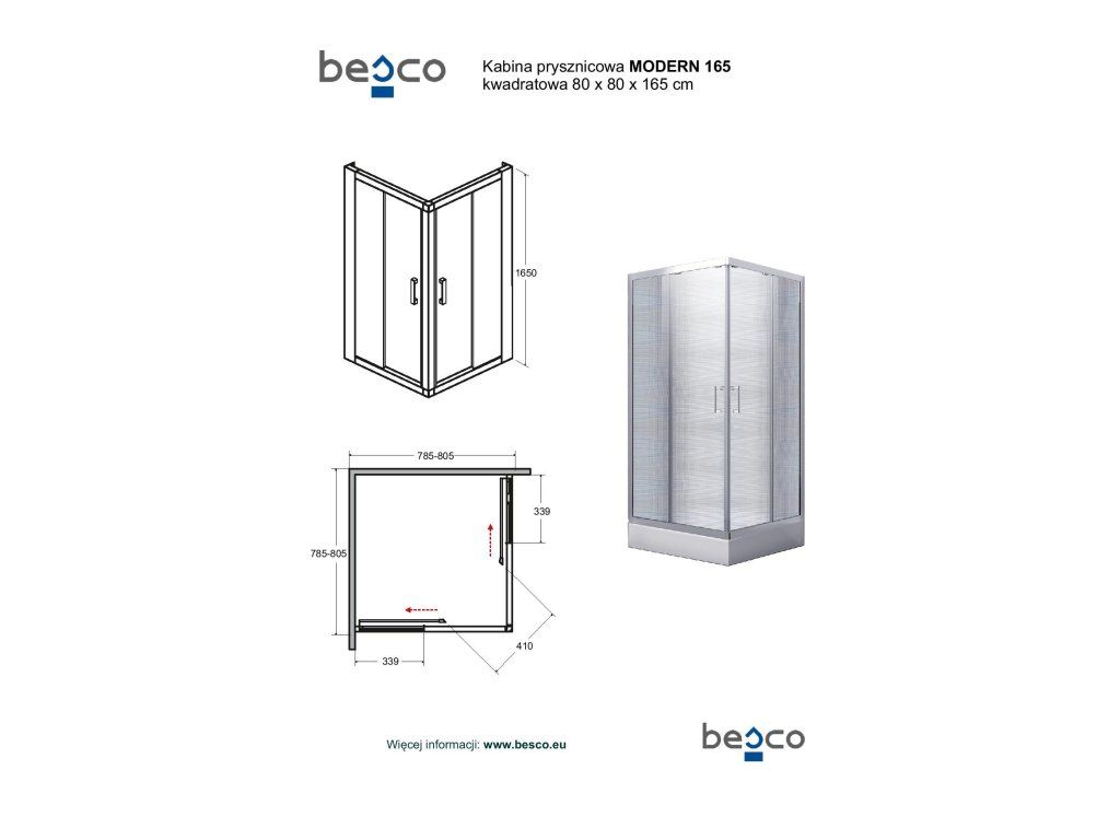 BESCO Čtvercový sprchový kout MODERN 165 Barva rámu - Chrom/Leštěný hliník (ALU), Rozměr A - 80, Rozměr B - 80, Rozměr C - 165, Směr zavírání - Univerzální Levé / Pravé, Výplň - Brick bezpečnostní sklo - 6 mm‌ BCMD80CTVER65CF