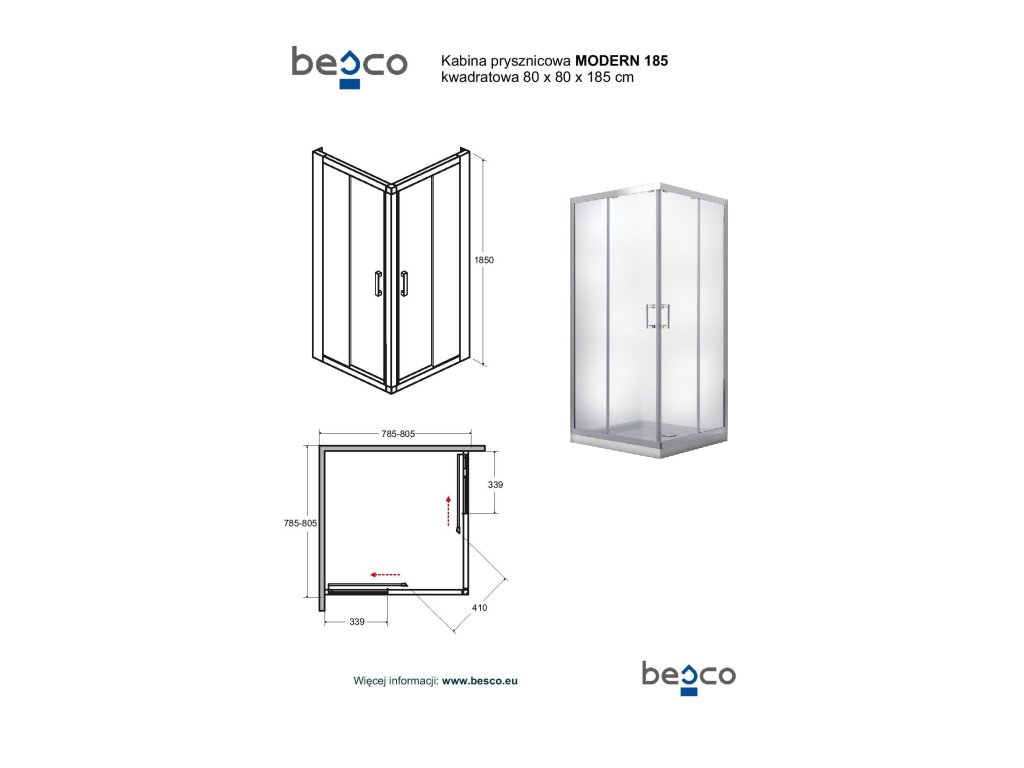BESCO Čtvercový sprchový kout MODERN 185 Barva rámu - Chrom/Leštěný hliník (ALU), Rozměr A - 80, Rozměr B - 80, Rozměr C - 185, Směr zavírání - Univerzální Levé / Pravé, Výplň - Frost bezpečnostní sklo - 6 mm BCMOD80CTVERCF