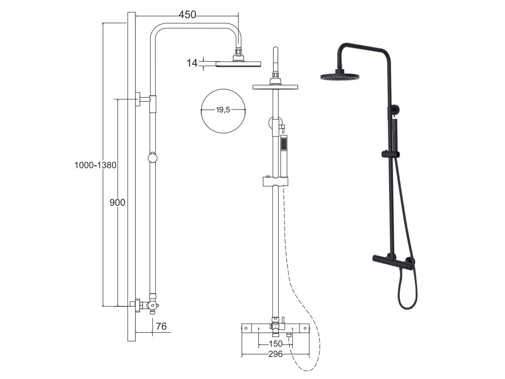 Rozsah nastavení hlavové sprchy od 1000 do 1380 mm.