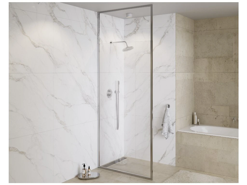 Designová varianta sprchového koutu Walk In, která se řadí mezi z jedny nejmodernějších trendů ve vybavení koupelen. Jedná se o otevřený sprchový kout, tvořený jednou stěnou z bezpečnostního tvrzeného skla, zabraňující nechtěnému rozstřiku vody. Povrchová úprava Easy Clean zabraňující usazování nečistot a tvorbě tzv. map po stékající vodě na skle. Voda je odváděna odtokovým kanálkem, umístěným v podlaze. Díky této technice jsou hliníkové profily chráněny proti korozi, poškození a zabarvení. Sprchový kout dodá Vaši koupelně na moderním a čistém vzhledu a Vaše koupelna získá ojedinělý designový nádech v nejmodernějším trendu.
