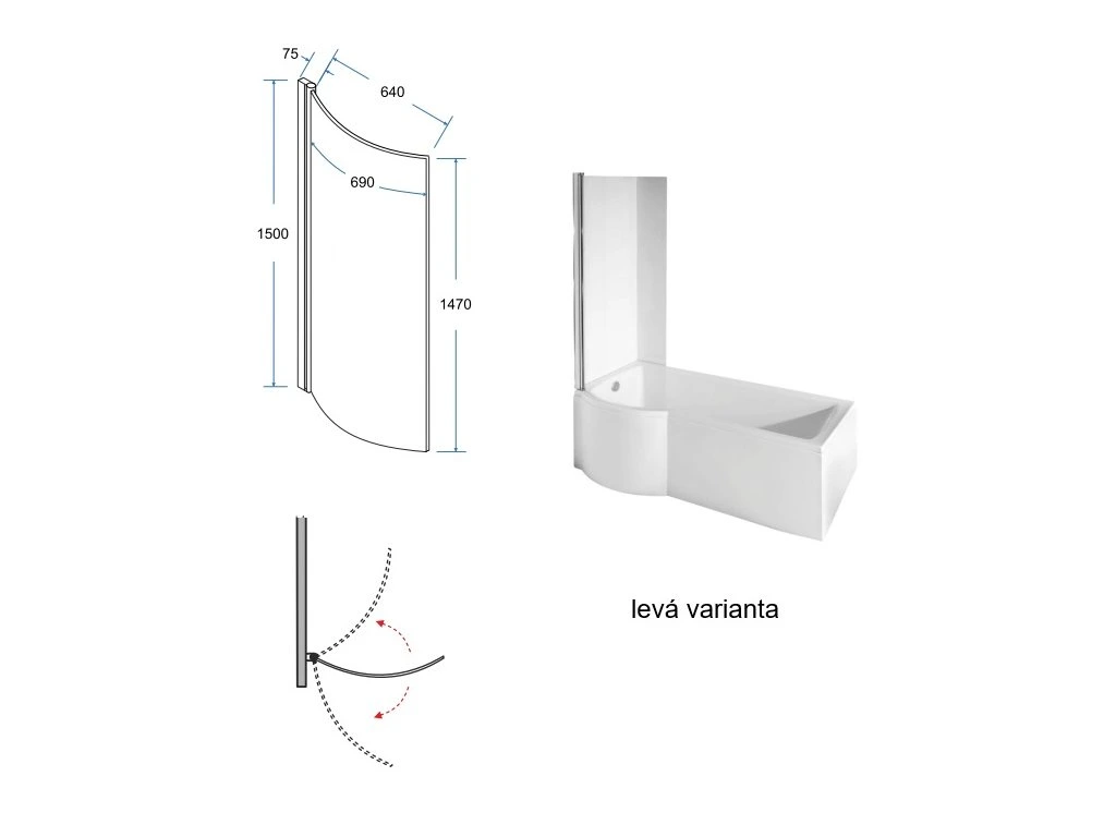 - typ vanové zástěny - 1-křídlová - rozsah otáčení pohyblivé části 180°