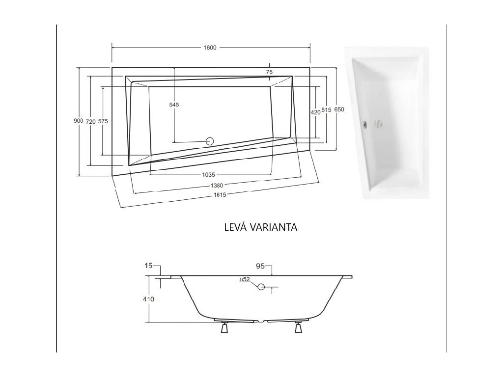 - rozměry vany - 160 x 90 x 55,5 cm (včetně nožiček)
