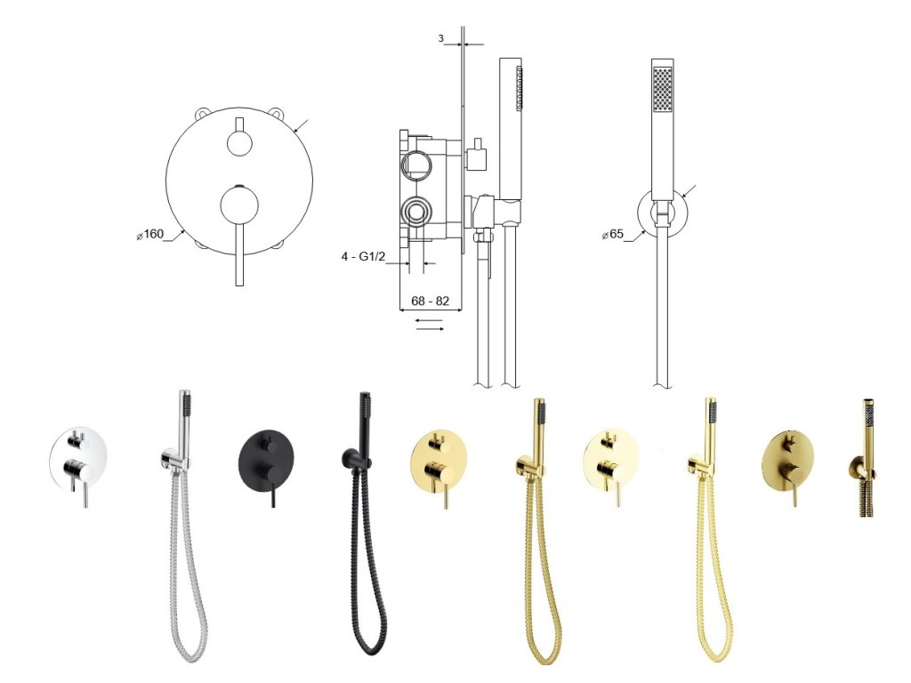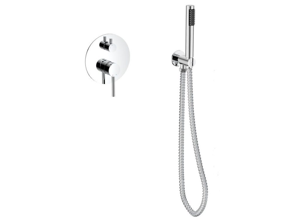 - Set obsahuje podomítkovou baterii, vývod ze stěny s držákem, ruční sprchu a hadici