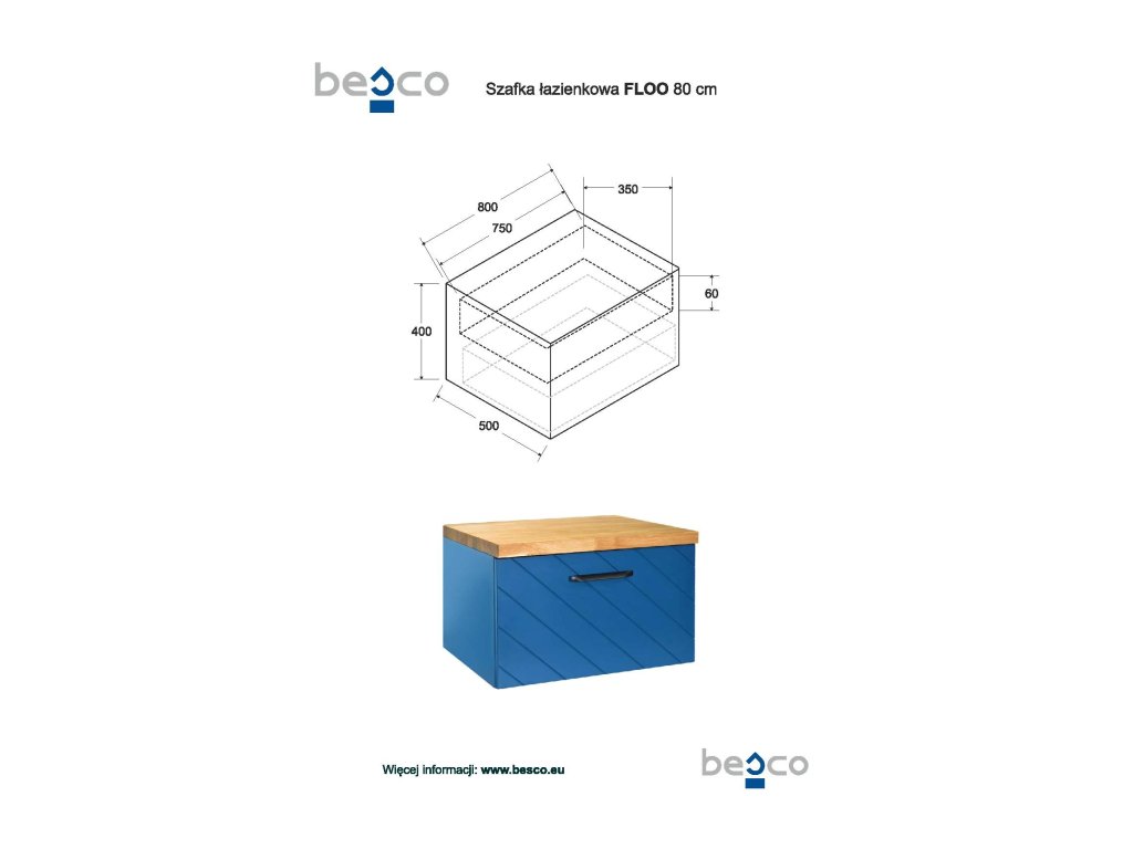 Populární elegantní design, široká barevná škála (čtyři barevné varianty - bílá matná, modrá matná, zelená matná a černá matná), kvalitní zpracování a moderní frézování na čele šuplíku, to je naše nová série FLOO. Součástí dvířek je i značkový tlumič dorazů pro tzv. tiché dovírání (soft-close). Nábytek dodáváme ve smontovaném stavu. Ke spodní skříňce si musíte doobjednat horní desku pod umyvadlo, kterou lze objednat ve třech barevných variantách (černá, mramor a dub).