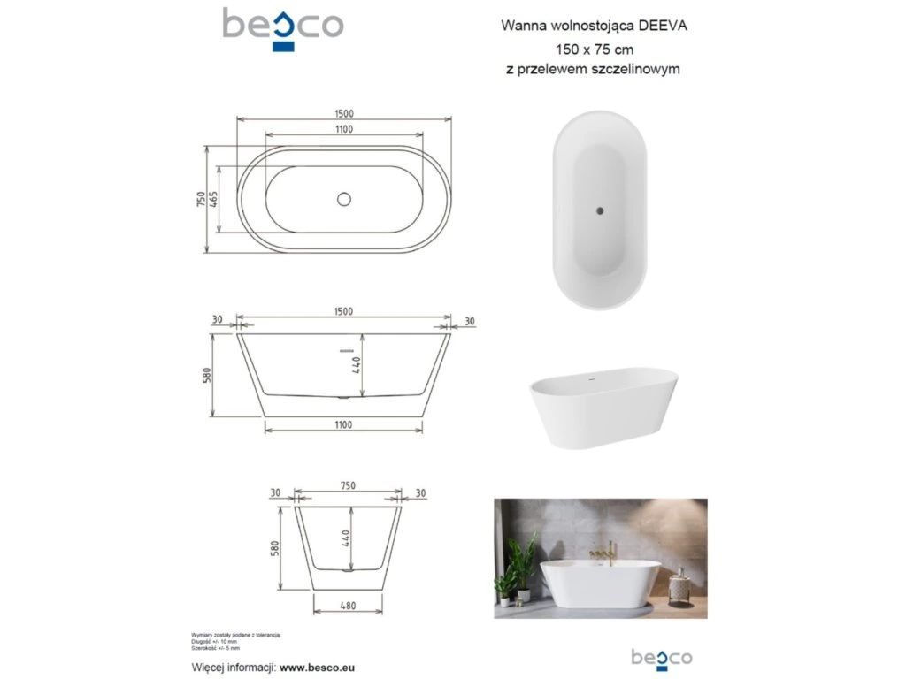 BESCO Volně stojící vana DEEVA bílá Barva - Bílá, Barva sifonu - Zlatá, Rozměr vany - 150 × 75 cm VANDEEVA150Z
