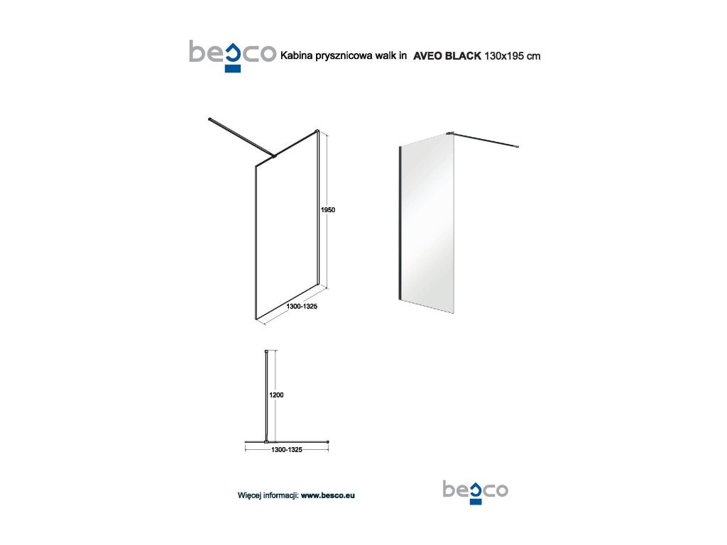 BESCO Walk-in sprchový kout AVEO BLACK Barva rámu - Černá, Pevná stěna - Bez pevné stěny, Rozměr A - 130, Rozměr C - 195, Výplň - Čiré bezpečnostní sklo - 8 mm BCAVEO130BL